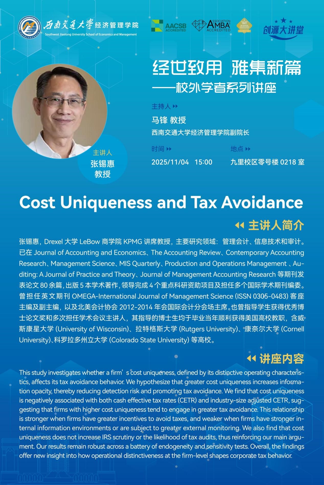Speaker ProfileDr. ZHANG Xihui is the KPMG Endowed Chair Professor at the LeBow College of Business, Drexel University. Her primary research interests lie in management accounting, information technology, and auditing.He is a prolific scholar with over 80 articles published in premier academic journals, including Journal of Accounting and Economics, The Accounting Review, Contemporary Accounting Research,...