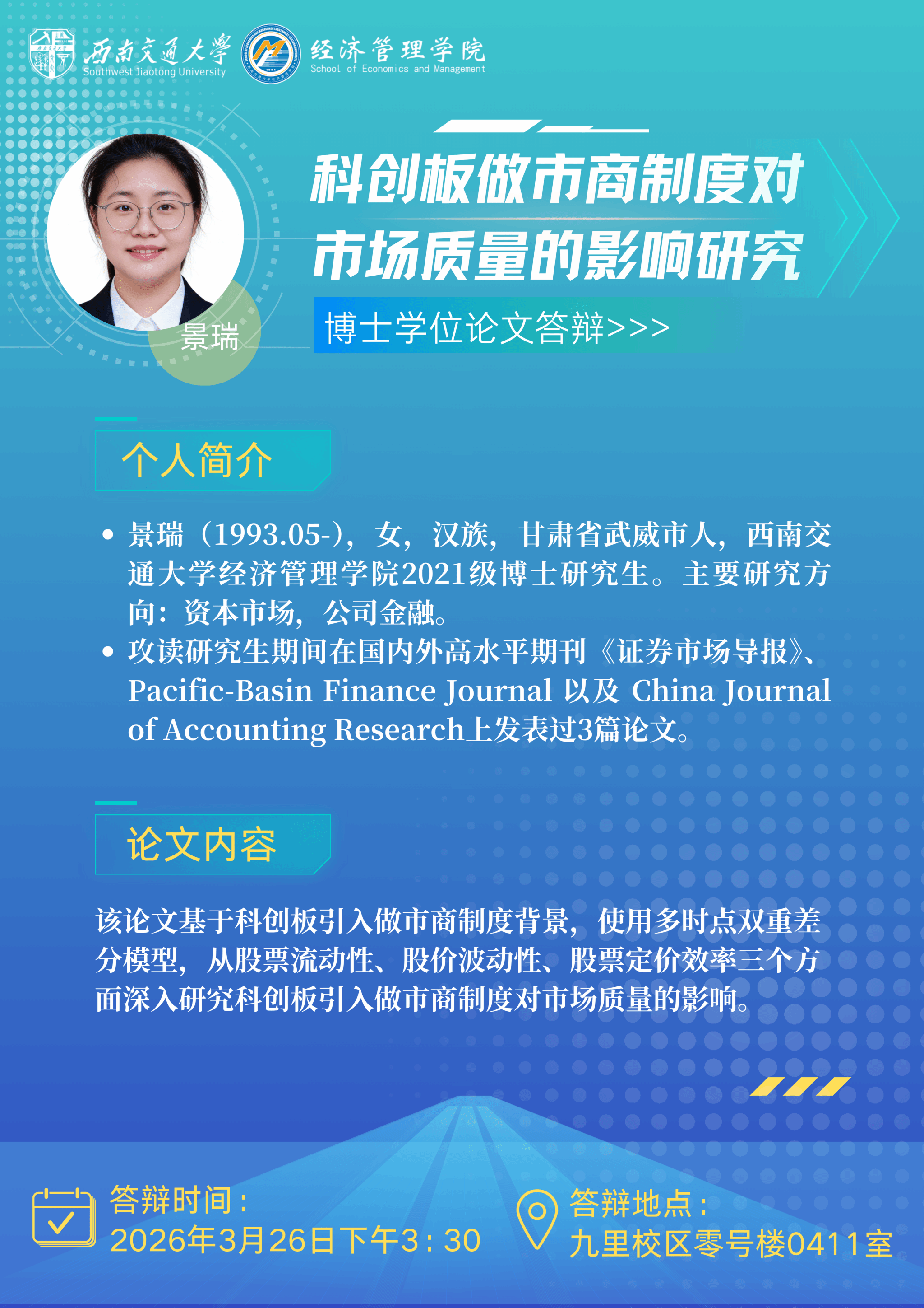2021级博士研究生。主要研究方向:资本市场,公司金融。攻读研究生期间在《证券市场导报》、《Pacific-Basin Finance Journal》以及《China Journal of Accounting Research》国内外高水平期刊上发表过3篇论文。