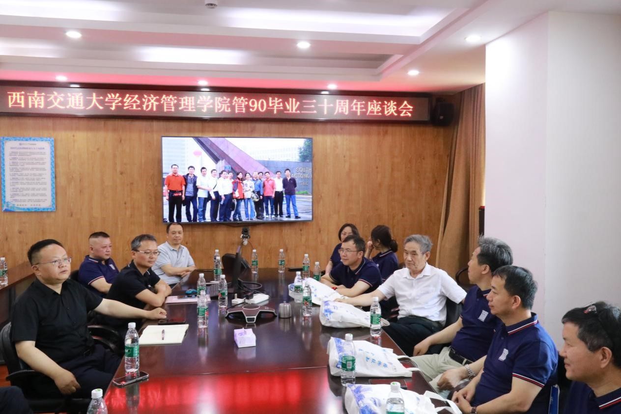管90毕业三十周年座谈会在九里校区0号教学楼0607会议室举行。出席本次座谈会的有学院党委书记郭强、院长韩科、综合事务办公室主任何鹏、学院教师代表张震宇,以及时任管理工程系党总支副书记梁锦唐和13名从海内外返校齐聚在一起的管90校友们。