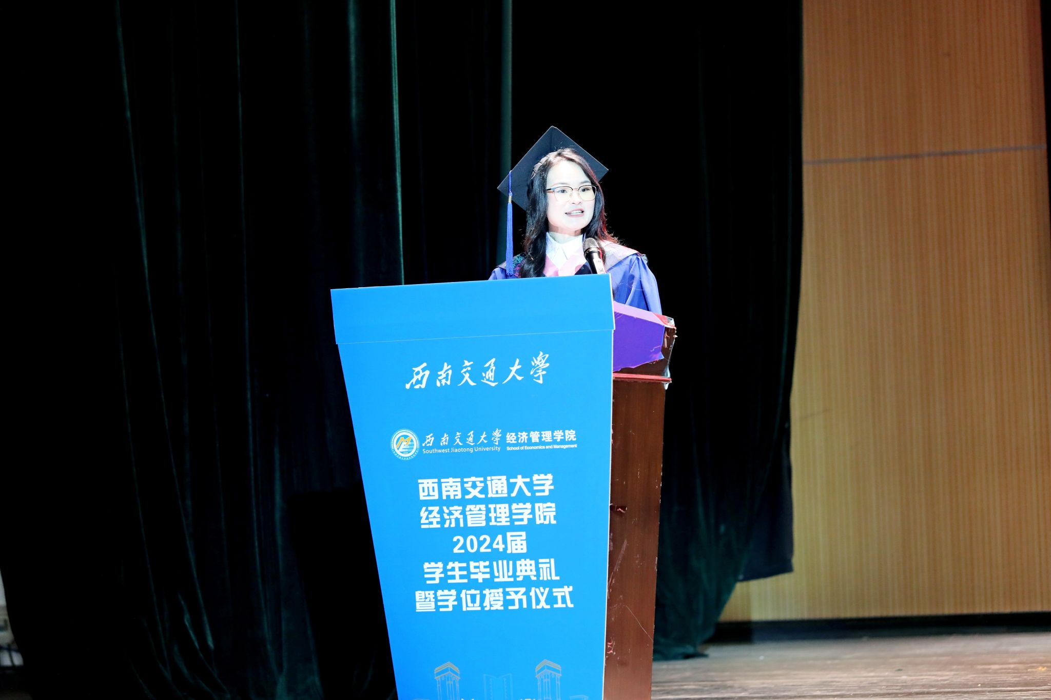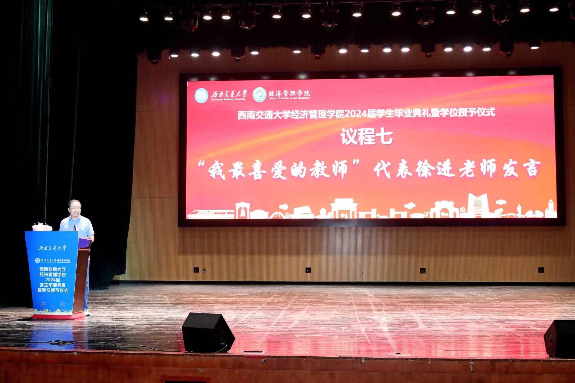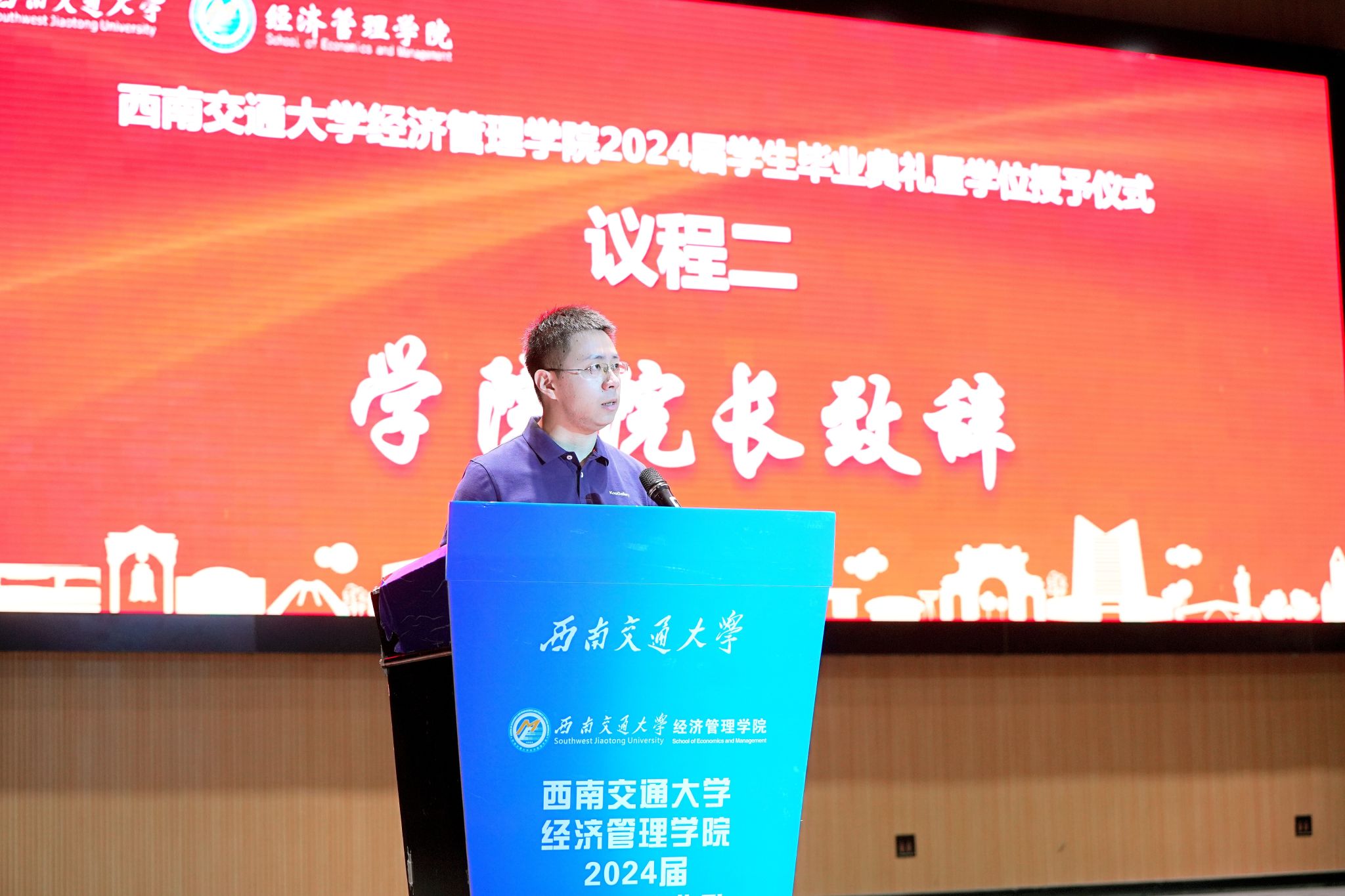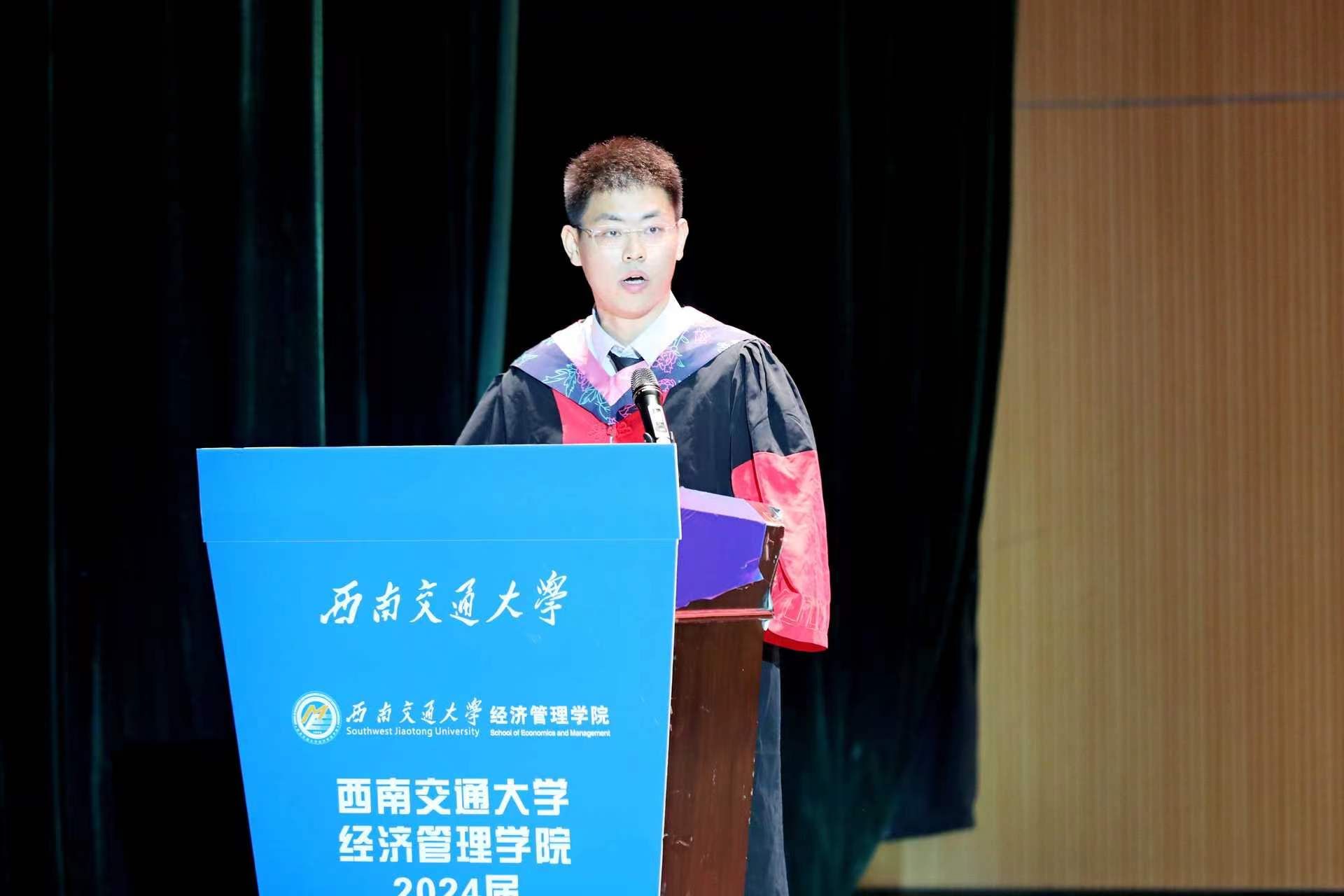 全体师生,向全院2024届毕业生表示热烈祝贺,并对他们在学院学习期间所取得的成绩给予高度认可。临别之际,他强调,希望同学们时刻谨记校训、院训,发扬交大精神,展现交大学子的担当。同时,韩院长为毕业生们提出了三点建议:一是提升境界的高度,二是拓展胸怀的广度,三是加深信念的深度,希望毕业生们带着学院的关心关怀,无惧风雨,奋勇前进,学院永远是经管学子们温馨的家。字字句句间,都寄托着对全体毕业生的深情嘱托与美好祝愿。