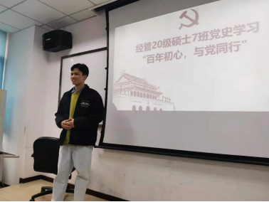 2021年时中国共产党成立100周年,立足党的百年历史新起点,面对中华民族伟大复兴战略全局和世界百年未有之大变局,为加强团员们的思想政治教育工作,树立正确党史观,贯彻落实精神文明建设,经管学院2020级硕士第七团支部于2021年4月19日19:30在0号教学楼0316教室开展了“百年初心,与党同行”的开学第一堂团课。