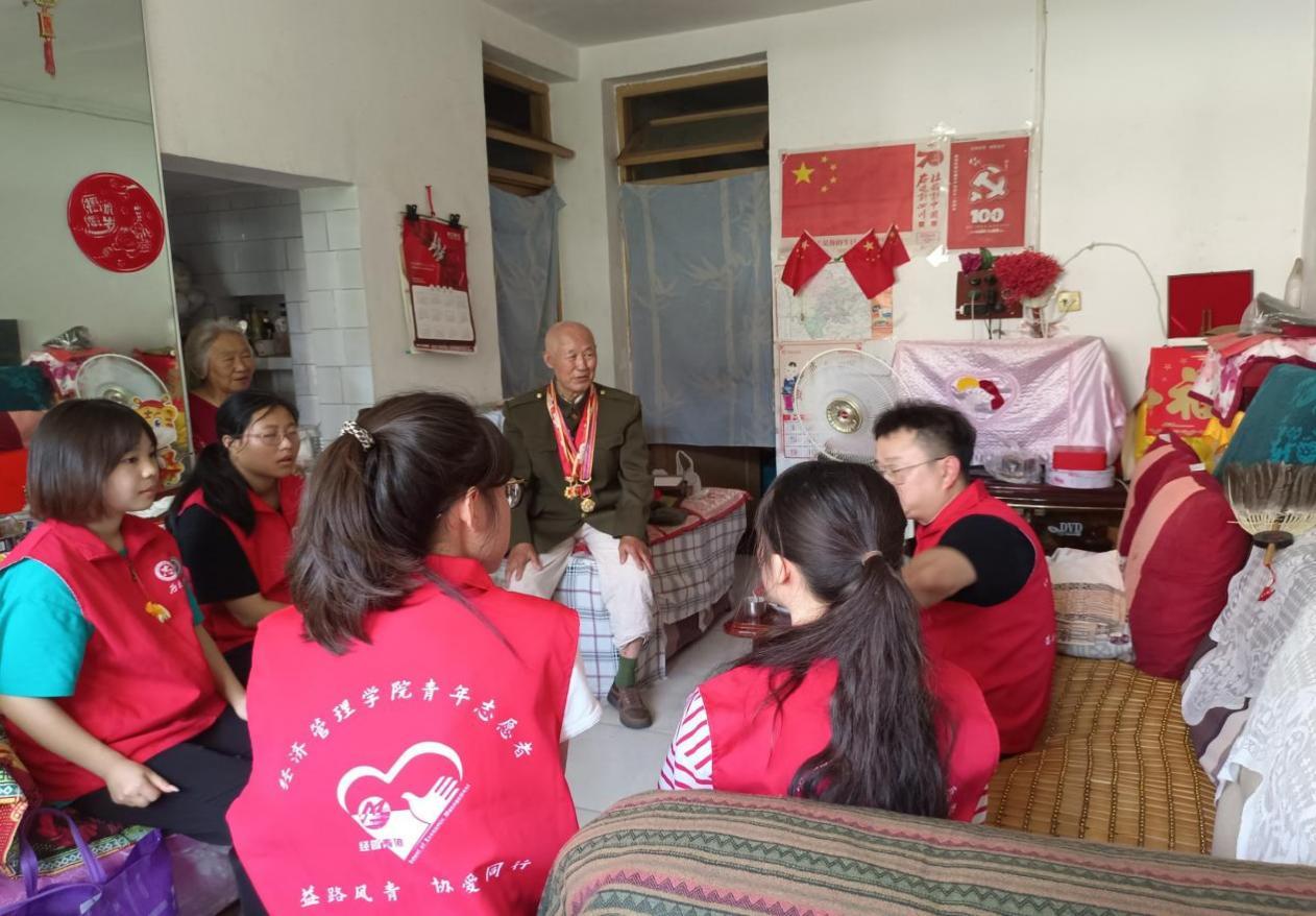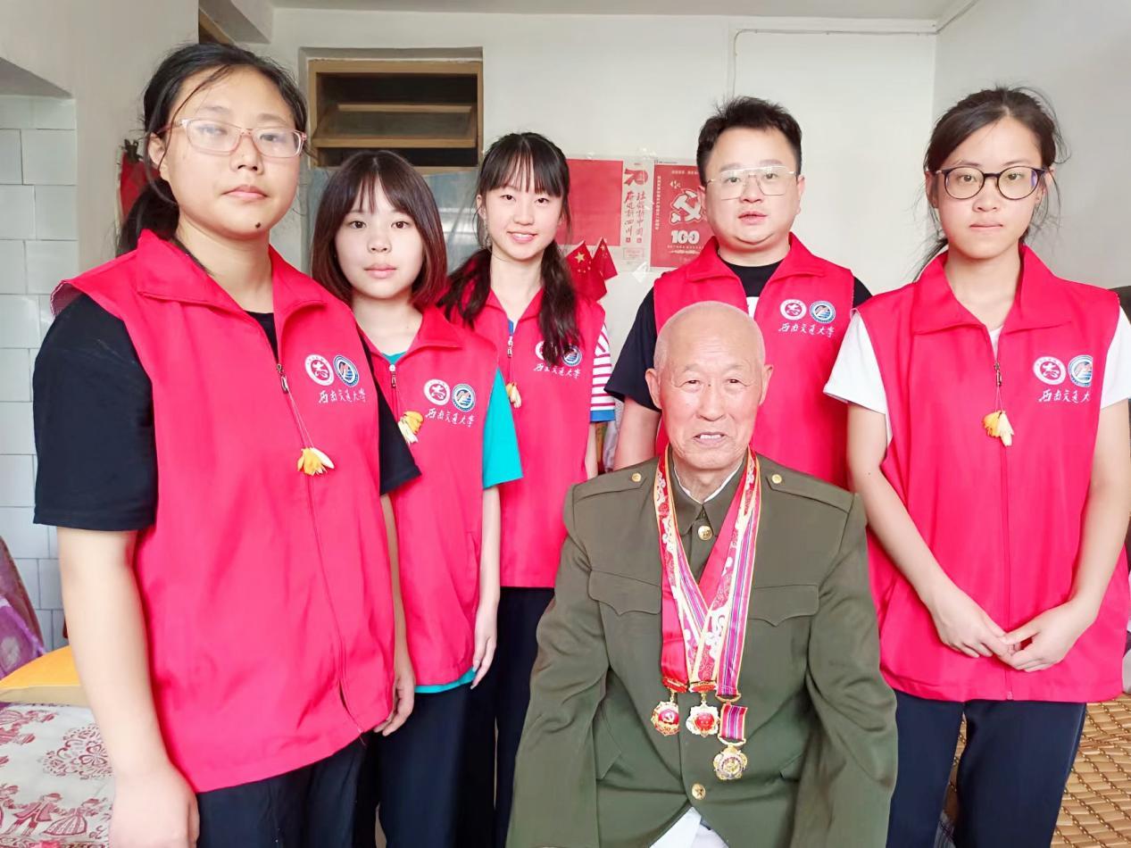 最后,实践队来到雅安市雨城区慰问采访了94岁的抗战老兵王廷儒,了解王老先生的革命经历。王老先生曾参加过辽沈、平津和抗美援朝等重要战斗,屡次负伤、功勋卓著。在老先生讲述的一个个鲜活的作战故事中,实践队员感受到了红军以及志愿军战士们不怕牺牲、英勇斗争的革命精神和共产党领导下的顽强斗争意志,深刻地认识到只此精神和力量方能铸就民族不屈的脊梁,唯有坚定不移地传承好、发扬好红色基因方能引领中国未来。