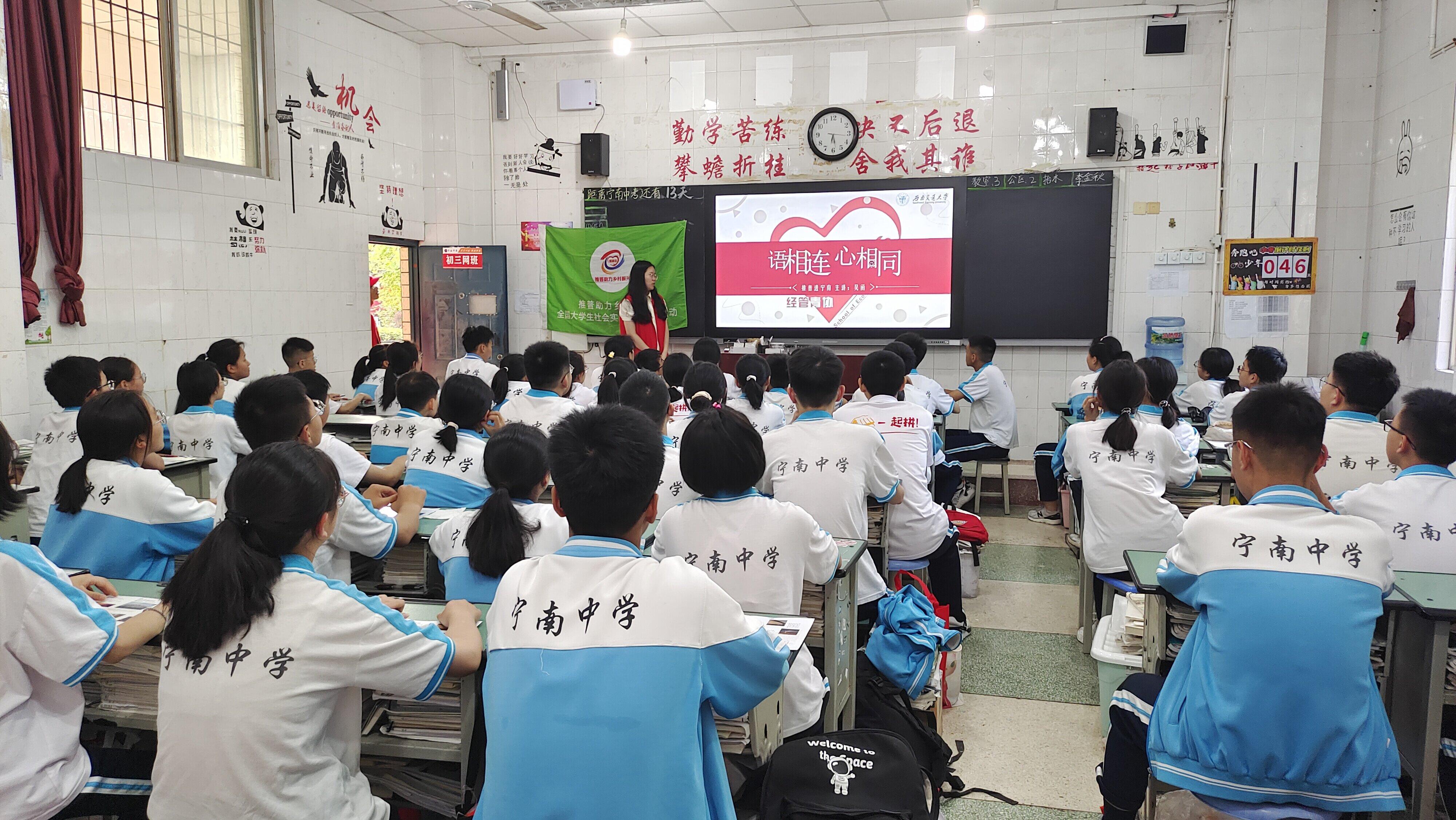 “语相连,心相同——推普助力乡村振兴“实践团队来到了宁南县,在这里开展了普通话推广及相关调研活动,为西部少数民族语言文字教育助力。在此次实践中,团队通过街头调研,定点摊位,课堂教育,走访宣传等形式,了解当地普通话使用情况,普及民族共同语言,助力乡村振兴。