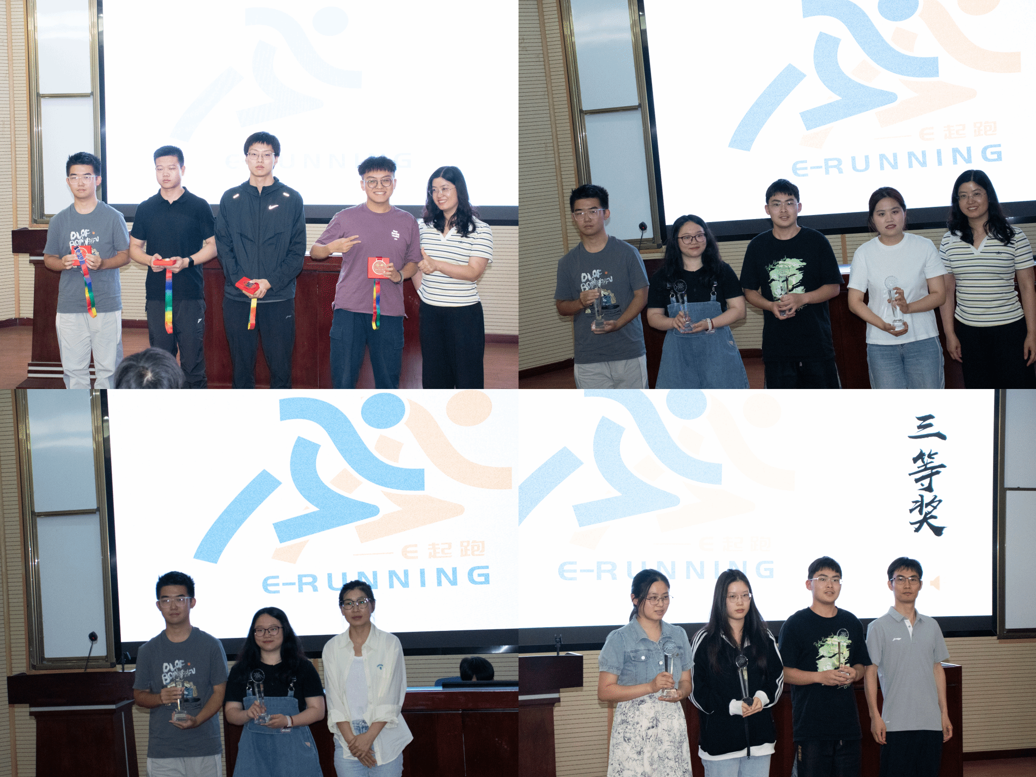 随后,活动对表现优异的团队和个人进行表彰。在众多参与队伍中,2支团队荣获一等奖,4支团队荣获二等奖,6支团队荣获三等奖,共同展现了团队协作的精彩成果。20名跑者凭借突出里程数获评“优秀个人”荣誉称号。由余小英老师、贾佳老师、苏扬老师为获奖代表颁奖并合影留念,鼓励大家延续运动热情,传递奋进力量。