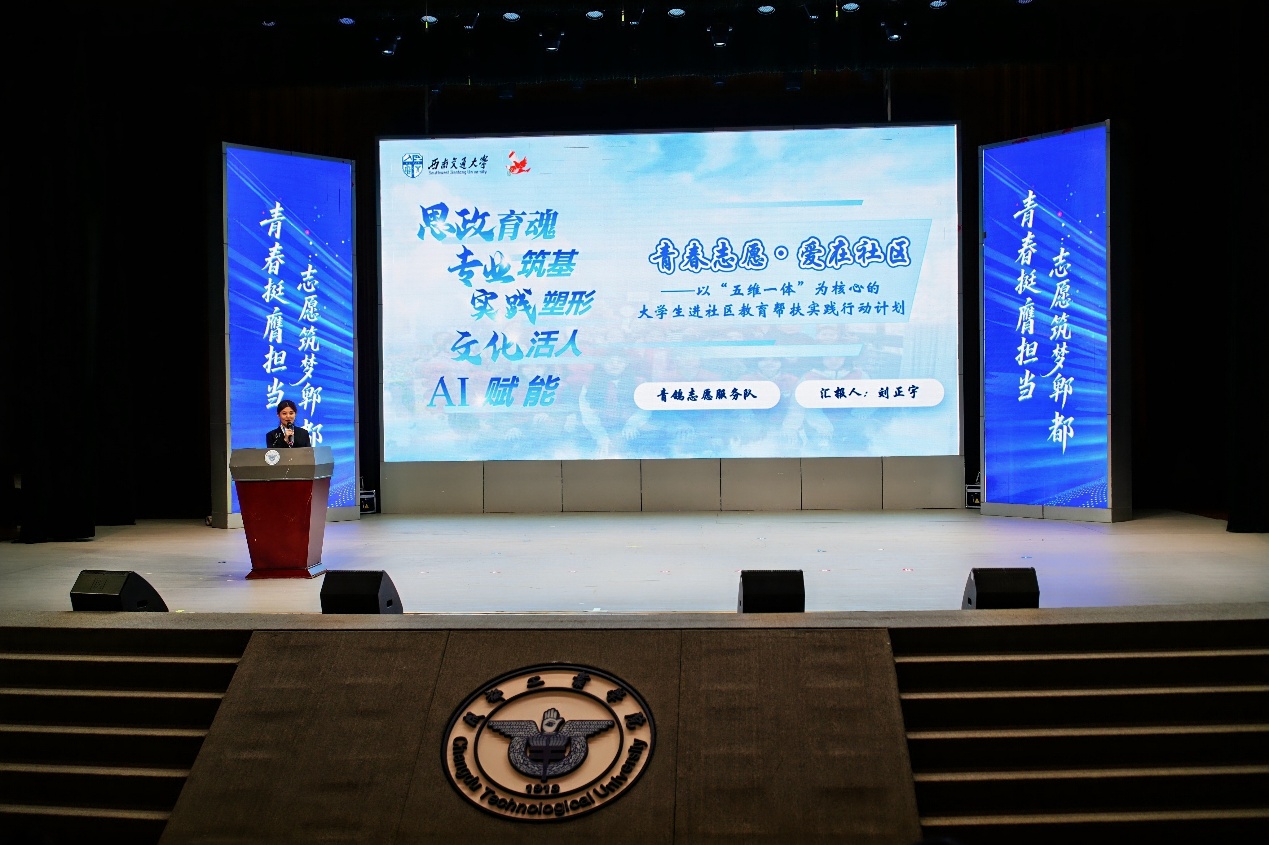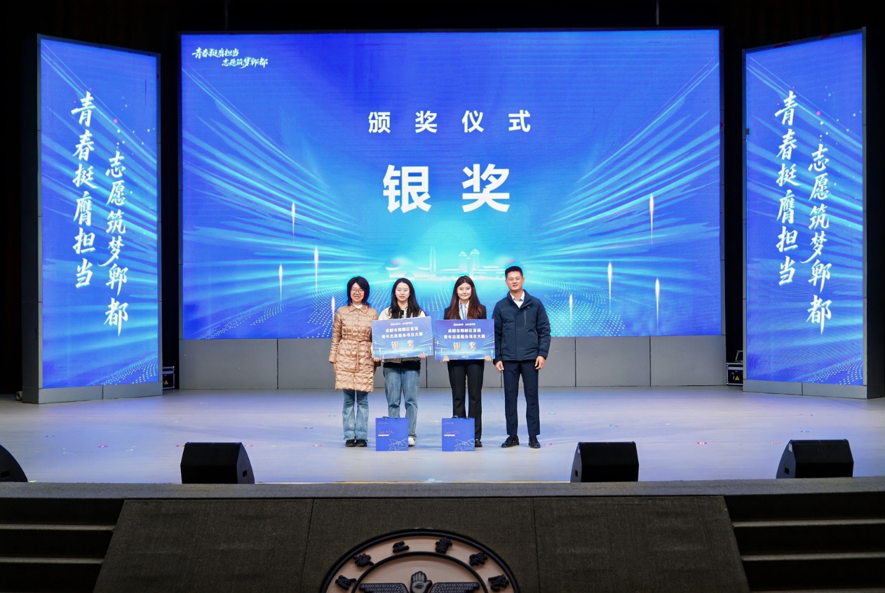 青春践诺守初心,志愿赋能暖郫都。为深入学习贯彻习近平总书记关于弘扬雷锋精神的重要论述,引导广大青年厚植为民情怀,全面提升青年志愿服务项目精准化、专业化、品牌化水平,2025 年 12 月 4 日,郫都区 2025 年度青年志愿服务项目大赛决赛路演活动于成都工业学院长虹会堂成功举办。西南交通大学青鸽志愿服务队申报的“青春志愿・爱在社区 —— 大学生进社区教育帮扶实践活动”,历经高校专家、基层社区负责人、资深志愿者代表组成的评审团多轮严格筛选与现场激烈角逐,最终斩获大赛银奖,为团队公益事业再添璀璨勋章!