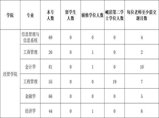 本次题目按各系学生人数来划分最低提交数,各位老师请参考下表提交;提交时在保障所要求的最低题目数量的基础上,可多提交题目,以给学生更多的选择。按教务处要求,原则上每位老师可最多指导10名学生,本届有辅修学位的学生、峨眉第二学士学位学生参加毕业设计(论文)。本届毕业设计(论文)工作需全体专任教师参与,如有特殊情况无法承担该项工作的,须报学院领导审批。请各系高度重视,认真落实各项安排,确保2026届本科毕业设计(论文)工作顺利开展。