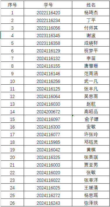 根据《中国共产主义青年团发展团员工作细则》和《新时代共青团员先进性评价指导大纲(试行)》等文件,经学院团委培训考察,共有26名符合条件并自愿申请团员发展对象的入团积极分子,考虑申请人年级人数分布,结合申请人综合表现情况,经学院团委讨论投票,现将2025-01期26名团员发展对象公示如下: