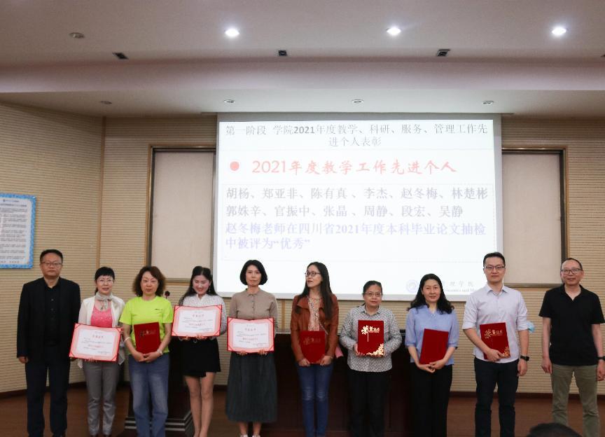 学院执行院长郭强宣读了表彰名单。学院对2021年度教学工作量和教学课堂质量评分前10%的12名教师(其中,赵冬梅老师指导的本科毕业论文在四川省2021年度本科毕业论文抽检中被评为优秀),科研工作量前10%的11名教授、副教授、讲师,服务工作量前10%的11名教师,综合考评前10%的5名管理岗位工作人员予以表彰。学院党政领导班子成员为受到表彰的先进个人颁发了证书,以兹鼓励。希望全院教职工以先进个人为榜样,积极投身教育事业,进一步增强使命感、责任感,奋发有为,齐心协力促进学院各项工作再上新台阶。