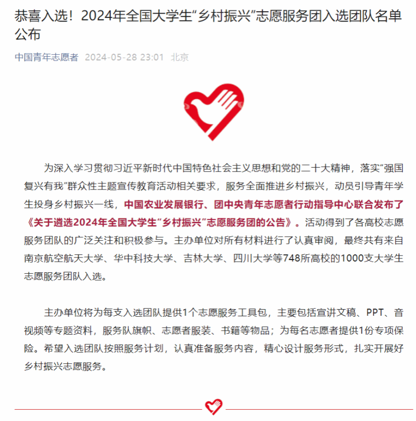 为深入学习贯彻习近平新时代中国特色社会主义思想和党的二十大精神,落实“强国复兴有我”群众性主题宣传教育活动相关要求,服务全面推进乡村振兴,动员引导青年学生投身乡村振兴一线,中国农业发展银行、团中央青年志愿者行动指导中心联合发布了《关于遴选2024年全国大学生“乡村振兴”志愿服务团的公告》。活动得到了各高校志愿服务团队的广泛关注和积极参与。