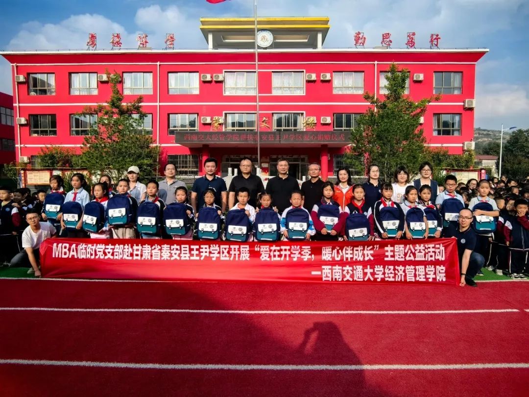 积极响应党中央、国务院关于乡村振兴的战略号召,学院党委书记郭强,党委副书记、纪委书记晏理斌,市场学系教授蒋玉石,综合事务办公室主任何鹏,专业学位教育中心副主任李洪辉及MBA临时党支部学生代表于9月27日深入甘肃省秦安县王尹镇,开展了“爱在开学季,暖心伴成长”主题公益活动,为祖国的生日献上一份特别的贺礼。西南交通大学挂职干部、秦安县副县长章春军和驻王尹镇胡坪村第一书记李勇及王尹学区负责人陪同参加了活动。