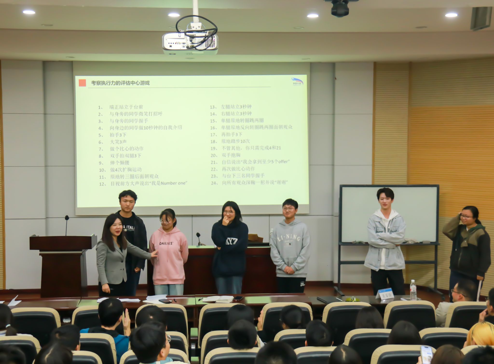 为使新生对个人核心竞争力有更清晰的认知,让新生了解企业面试的具体情景,蒋玲邀请了6名新生上台进行情景面试小游戏,同学们踊跃参与、积极互动,游戏后纷纷发表了各自的感悟。