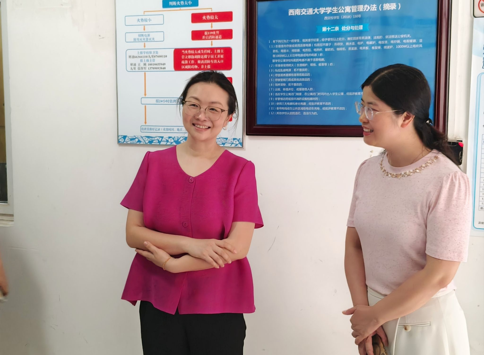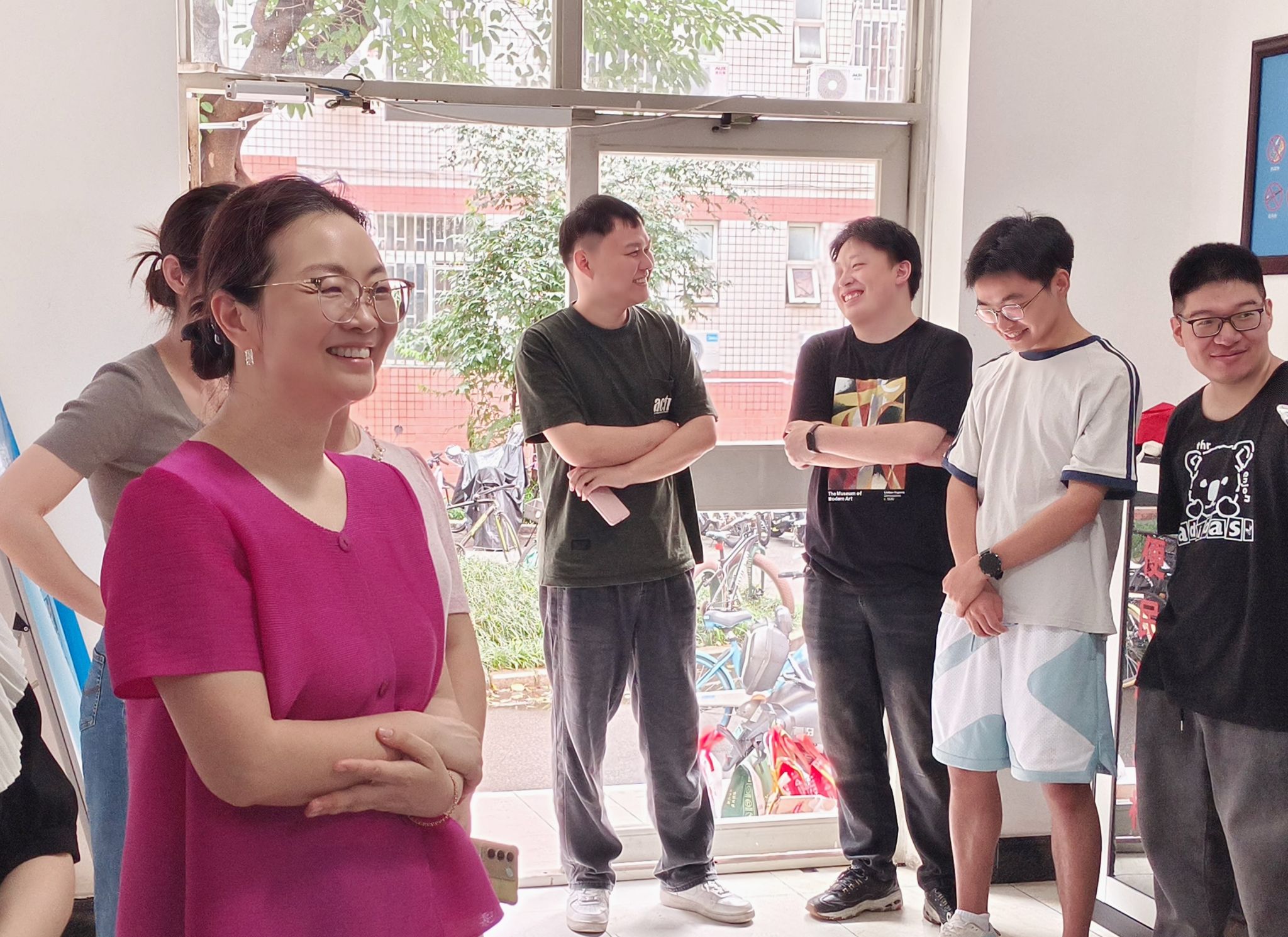 “离校手续办理到哪一步了?”“离校前还有什么困难?”“学习生活上对学校有什么意见或建议?”在眷诚斋十二栋三单元,老师们细致了解同学们的离校准备情况,认真倾听他们的所思所想、所盼所愿。楼道内,同学们向老师们分享收到毕业礼物的欣喜,并对学院的精心培养、悉心关怀感到非常暖心。
