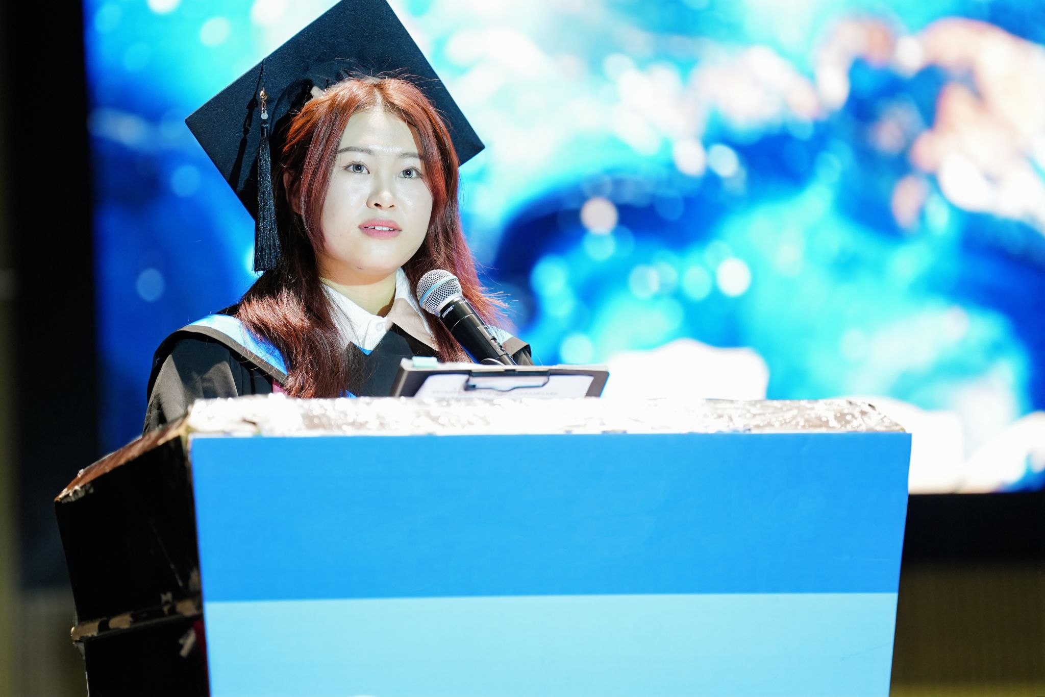 本科生毕业生代表毛宇欣、研究生毕业生代表李若晨、MBA毕业生代表张永恒分别发言。毛宇欣回顾了自己从懵懂到成熟的大学成长经历;李若晨分享了自己在硕士阶段学术研究、实践工作等方面获得的能力提升和成长;张永恒分享了自己奔走在课堂与职场之间的求学之路,不忘初心、拥抱挑战,在前行中连接彼此、照亮他人。毕业生代表真情实感的流露,饱含着对学院老师、同窗挚友的不舍与感谢。