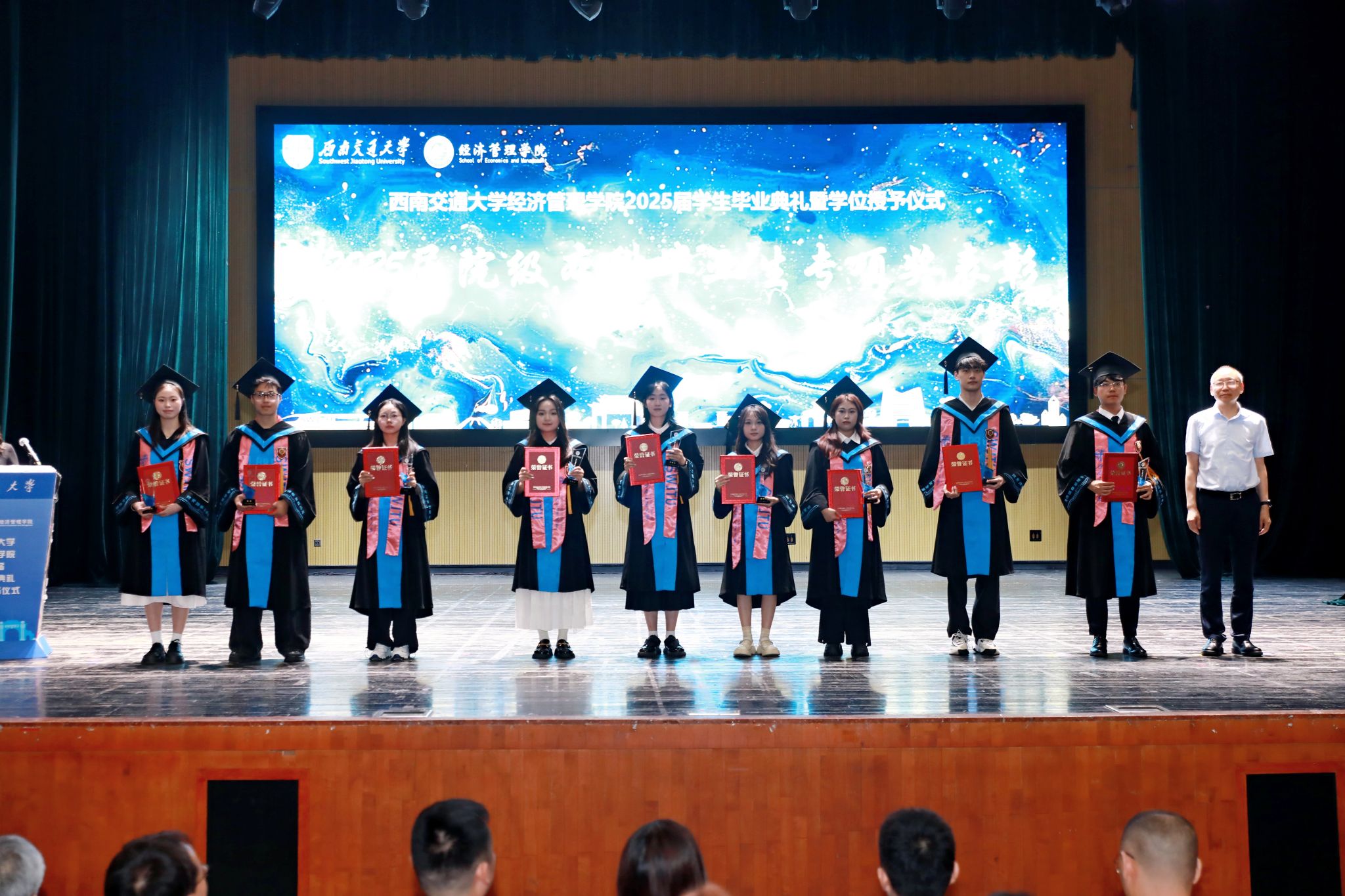 学院党委书记蒋佳宣读2025届本科生、研究生省级及校级优秀毕业生名单,学院副处级组织员晏理斌为获奖毕业生代表颁奖。省级及校级优秀毕业生严谨求知、知行合一,在知识求索与综合发展中树立榜样,让更多学子从榜样力量中汲取向上、向善、向美的动力。