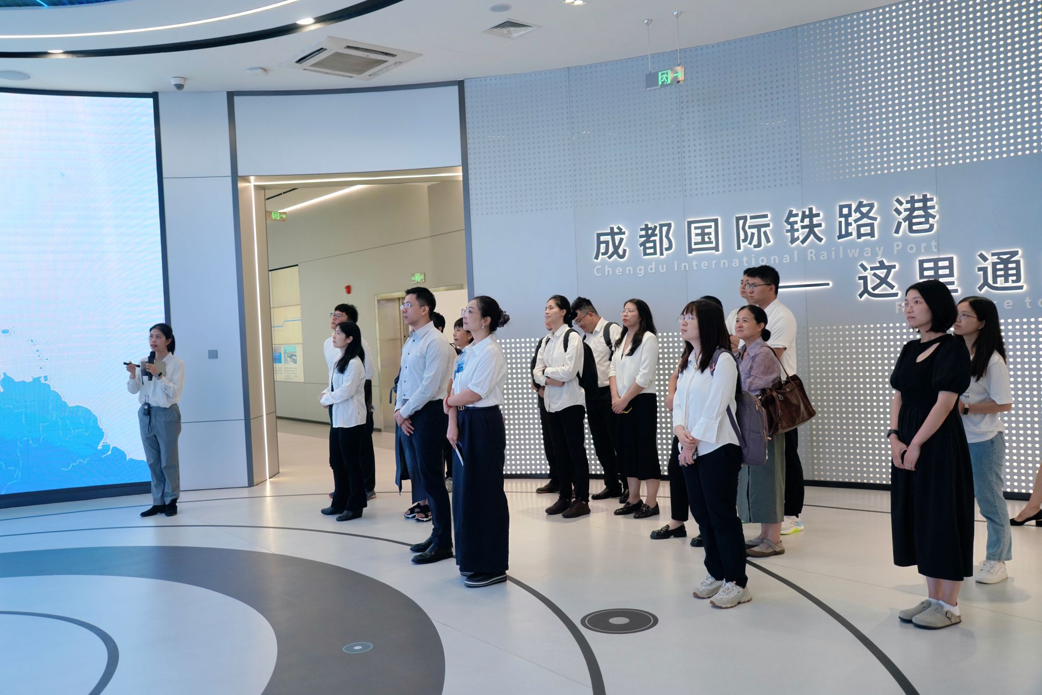 签约仪式结束后,师生代表前往成都国际铁路港展示中心开展实地调研。在讲解员的引导下,师生们通过动态沙盘、数字大屏、实物模型等多元化展示形式,系统了解了成都国际铁路港从“单一货运站”到“国家对外开放口岸”的发展历程,以及中欧班列(成都)开行以来在“通道建设、货源组织、国际合作”等方面的运营成果。
