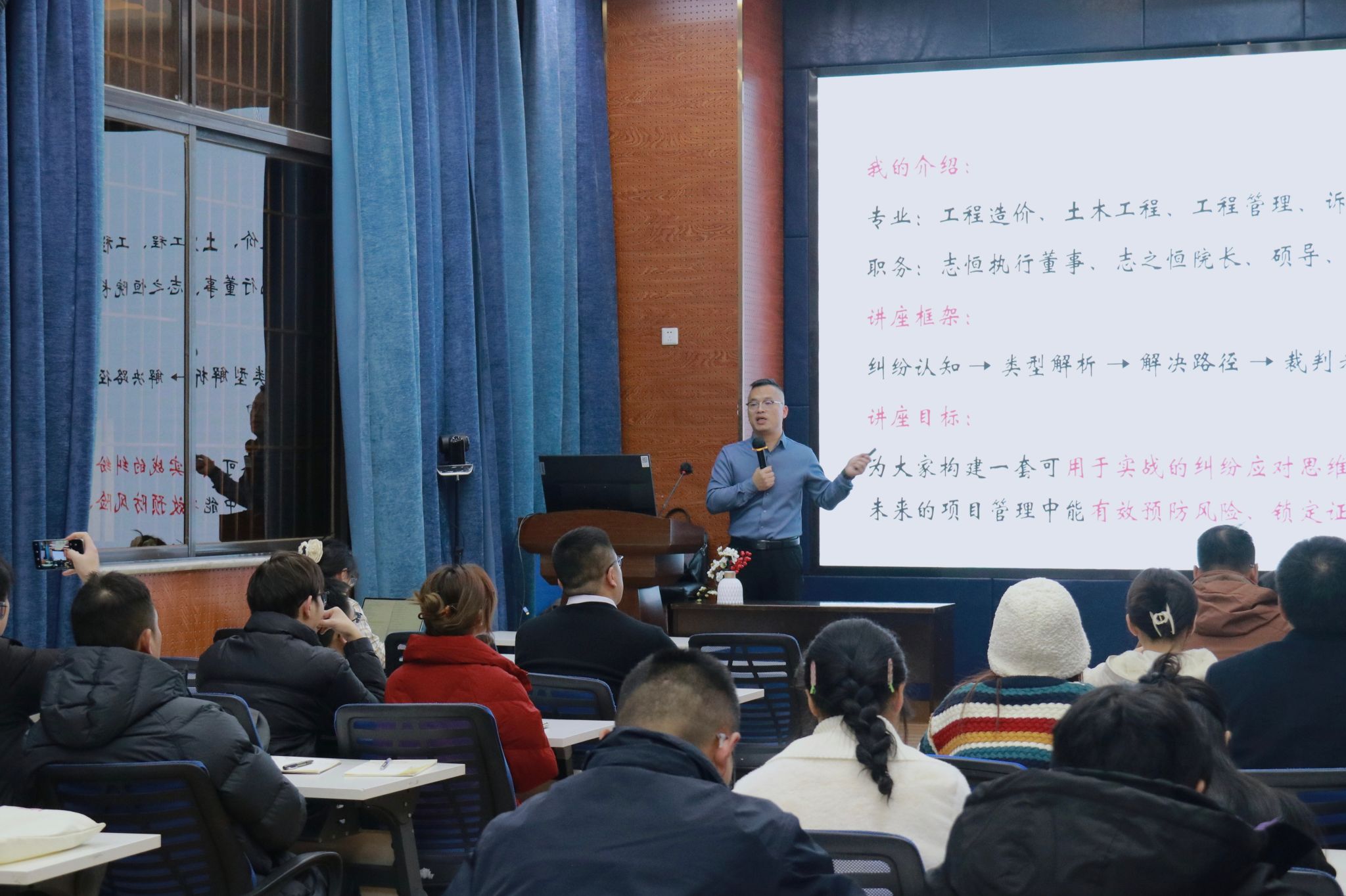 讲座伊始,刘江围绕建设工程中频繁出现的几类纠纷展开专业讲解,重点分析了施工合同效力争议、价款结算分歧、质量责任认定以及工期延误等核心问题。他结合多年从业所积累的实战经验,深入剖析了这些纠纷的产生逻辑和行业共性问题,帮助听众从源头理解纠纷形成机制。