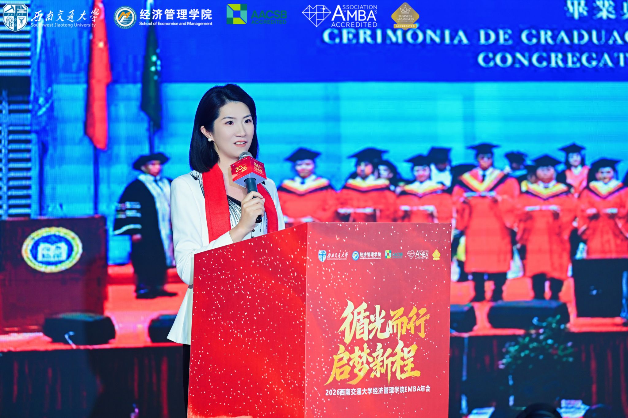 随后,2016级EMBA校友、广东南博集团大湾区西岸区域总经理、澳门中西创新学院持续教育中心主任陈银娇作为校友代表发言。她分享了自己毕业后在行业深耕的创业历程与人生感悟,细数了在母校求学期间的珍贵回忆,表达了对母校培育之恩的深切感激,以及传承交大精神、助力母校发展的坚定决心。她的发言情真意切,传递了校友与母校休戚与共的深厚情怀,引发了现场校友的广泛共鸣。