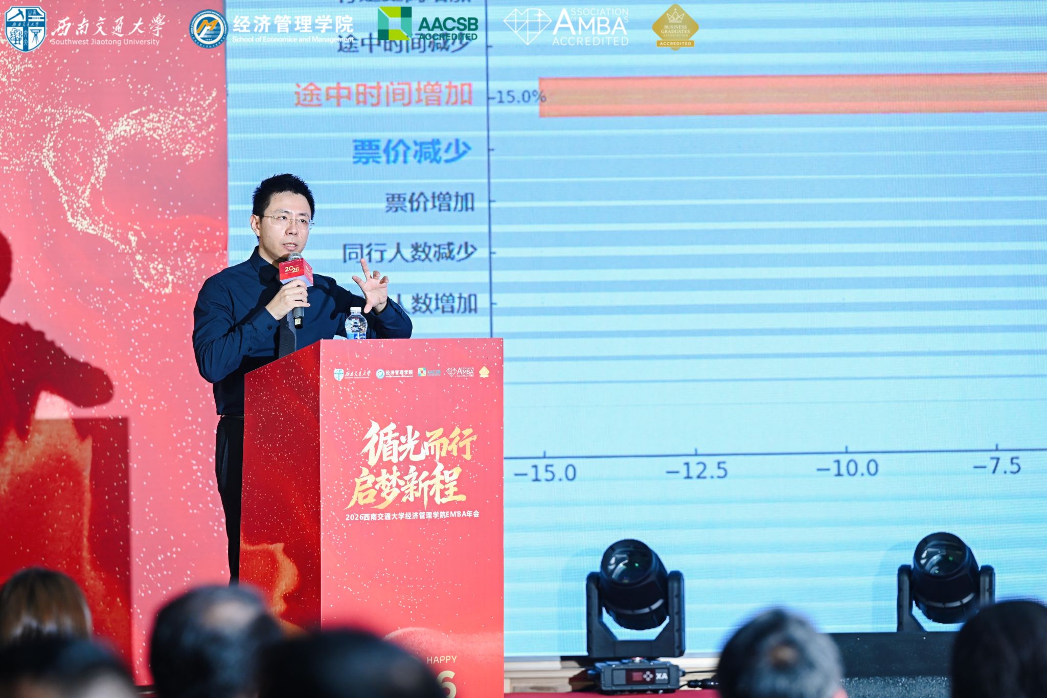 院长韩科受邀登台,作为学院发展的引领者与科研带头人,他围绕重大战略工程协同治理、产教融合创新发展等主题,拆解学院科研团队在eVTOL市场前景、低空文旅商业模式等特色研究中的实践经验,其真知灼见既为校友精准把握发展趋势、破解运营难题提供了新思路,也充分彰显了学院“交通+管理+科技”的特色育人理念,为整场年会注入深刻的思想力量。