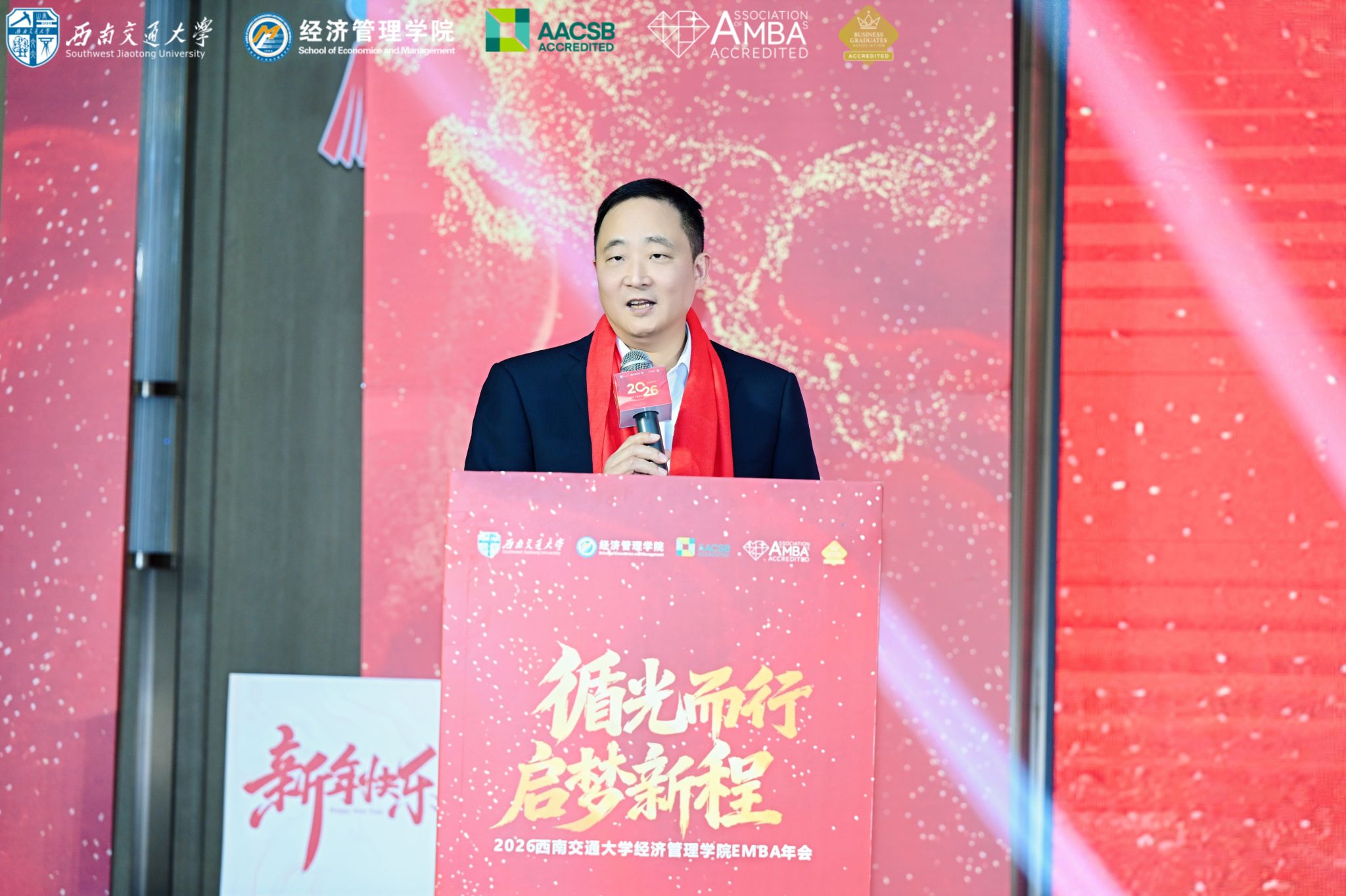 西南交通大学党委副书记高平平代表学校对年会的顺利举办表示热烈祝贺,向莅临现场的各位来宾、校友及社会各界朋友致以诚挚问候与崇高敬意。他回顾了2025年学校取得的成绩,并寄语各位EMBA校友,希望大家继续做母校发展的参与者、做母校声誉的传播者、做母校建设的支持者,与母校同心同德、携手并进,共谱一流大学建设新篇章。