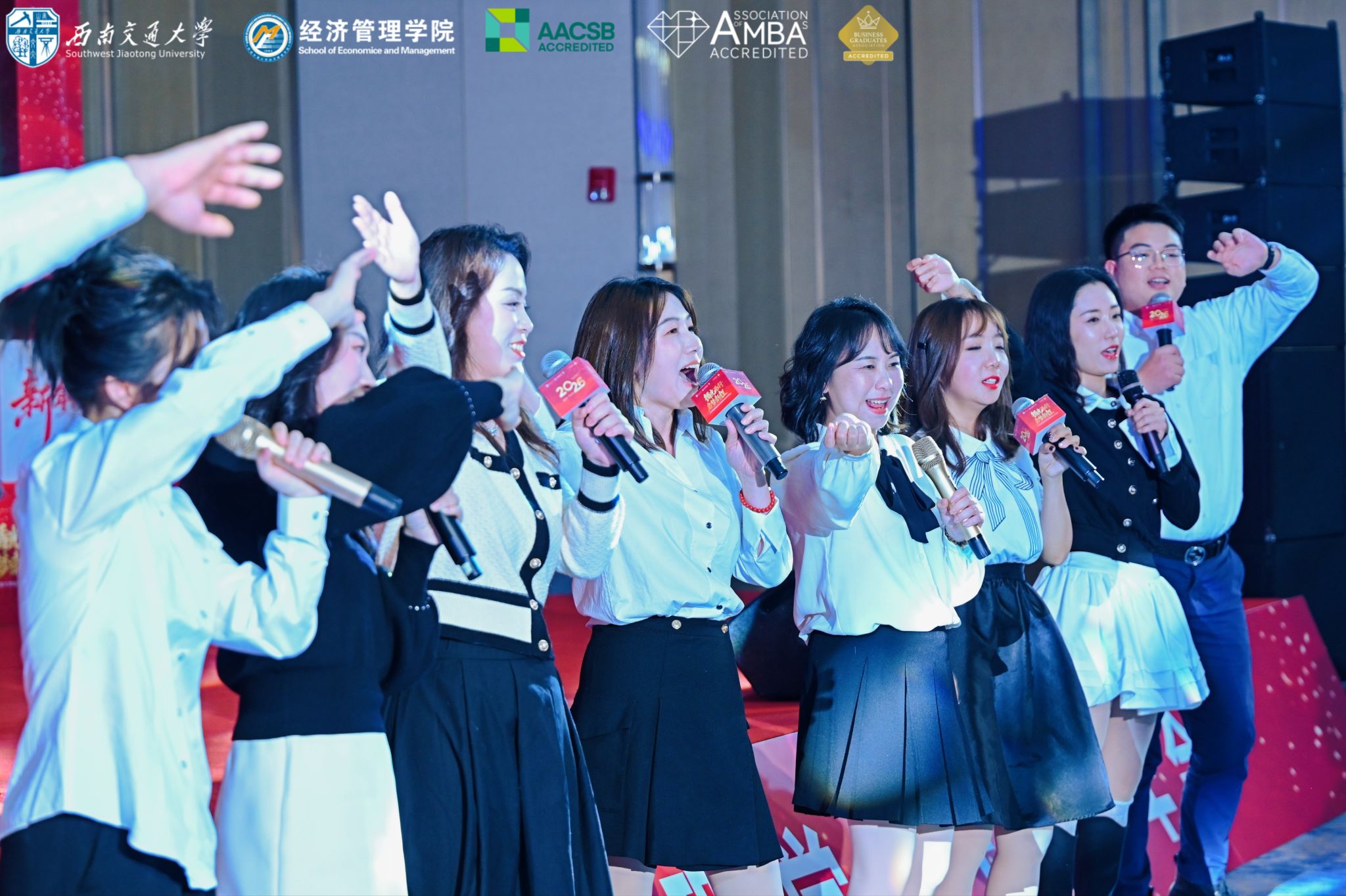 历届EMBA班主任老师与2024级、2025级学生代表共同唱响《不要慌太阳下山有月光》。在悠扬的旋律中,师生同台、其乐融融,既展现了“教学相长”的深厚情谊,也传递了携手同行、共赴未来的温暖力量,让年会现场充盈着浓浓的师生温情。