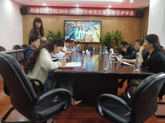 2018-2019学年研究生荣誉称号评审会。到场的教师代表有郝辽钢、张震宇、赵冬梅、李军、吴静、郭姝辛、窦祥胜、敬永春等,会议由贾佳主持。