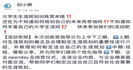 “仰瞻前路,成就未来”——大学生生涯规划训练营推广活动通过线上转发和评论的方式,为在校大学生提供了一个在线交流的平台。在这个平台上大家可以相互交流、各抒己见,可以认识大学生涯规划、提出自己对大学生涯规划的问题,也可以分享自己对大学生涯规划的看法,从而帮助学生群体尽早明确个人发展目标,在认识自我、了解自我、驾驭自我的前提下,探索自己的性格潜能,激发同学们进行大学生涯自我规划的积极性和主动性。