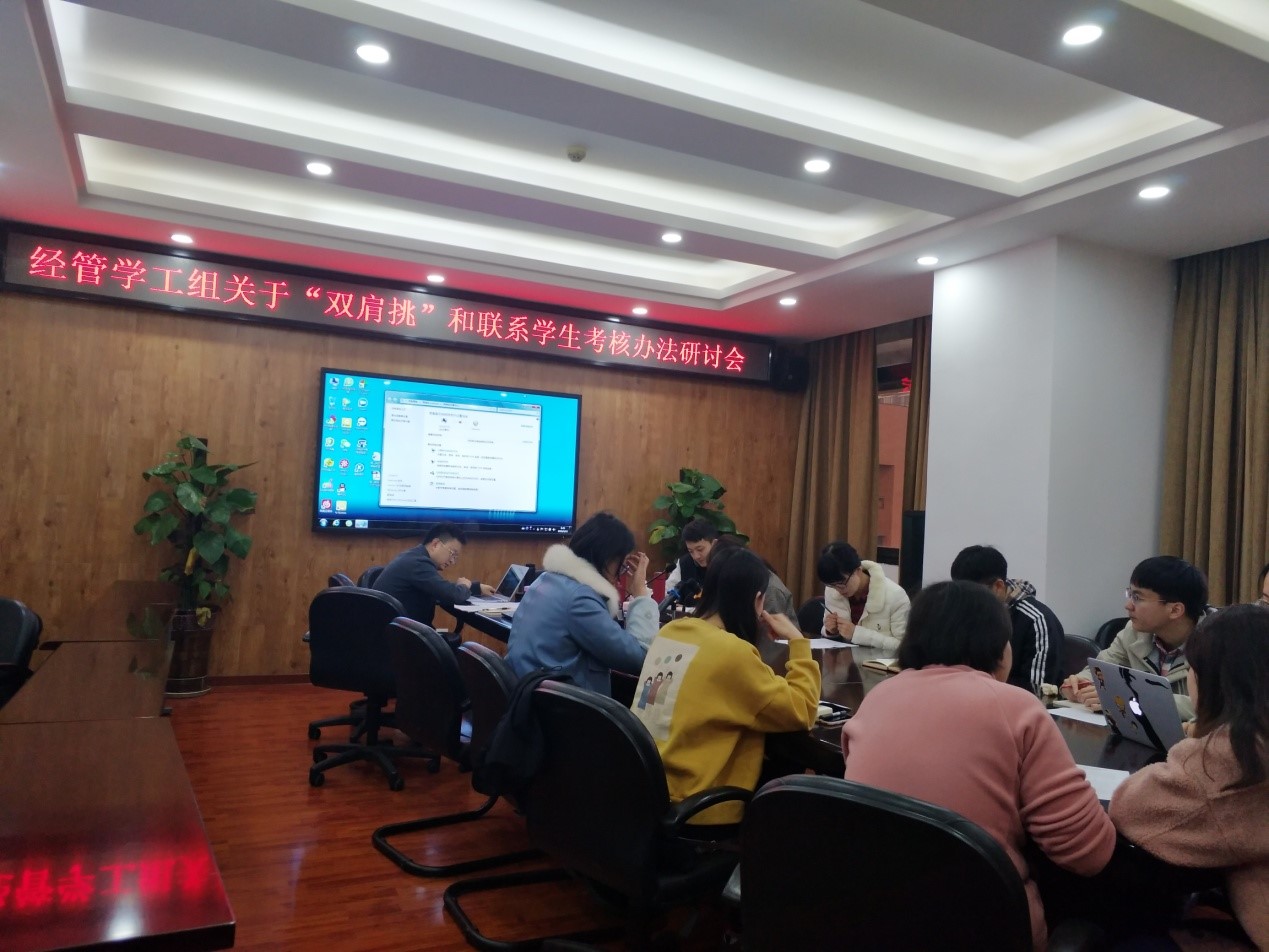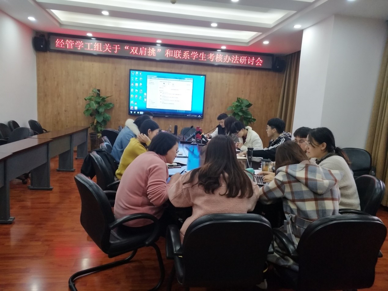 首先在贾佳老师的主持下,大家对《中共西南交通大学委员会关于进一步加强辅导员深入学生联系学生工作管理考核办法》和《西南交通大学专职辅导员“双肩挑”资格认定及薪酬管理办法》进行了认真地学习讨论,各位辅导员根据自身实际情况对《办法》提出修改意见。接下来,贾老师和大家讨论了关于经管学院学生组织举办各类活动时所出现的问题,以及解决办法。