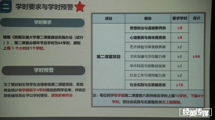 开展关于第二课堂的宣讲,旨在让2021级全体新生深入了解第二课堂的内容、毕业相关要求及意义。西南交通大学第二课堂运营中心的助理学姐为全体新生做了详细的讲解。