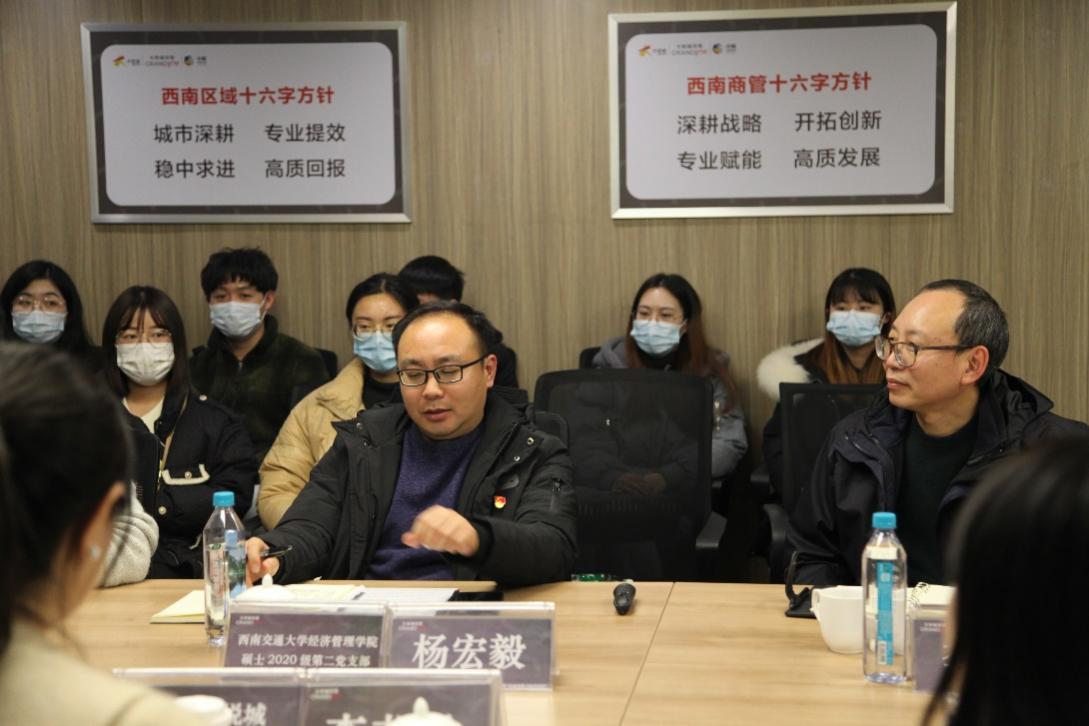 为学习贯彻党的十九届六中全会精神,全面开展党建活动,加强思想政治建设与实践。2021年12月15日下午,西南交通大学经理管理学院硕士2020级第二党支部在党委副书记杨宏毅、副院长李良以及支部书记贾佳老师和研究生辅导员陈海波老师的带领下,至成都大悦城公司开展“校企联合抓党建,党建引领促发展”主题活动。