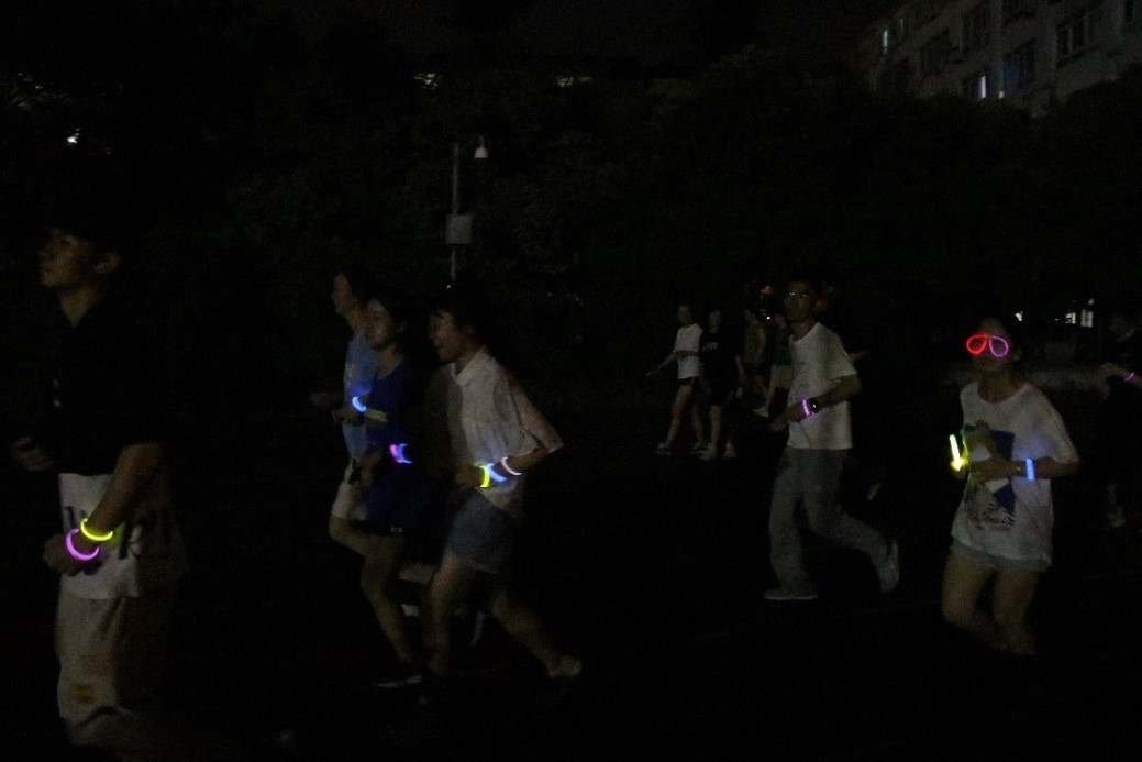 点点荧光在校园流动成画,声声笑语在夜晚谱写成歌。6月14日晚8点30分,学院毕业生荧光夜跑活动在九里校区顺利举行。开场前,同学们首先领取了跑步时随身携带的荧光套件并合影留念。伴随着激昂的音乐,同学们正式开始了欢乐的夜跑活动。大家从南门出发,途经镜湖、求实路口、田径场、篮球场、网球场、茅以升图书馆、零号教学楼。夜跑活动使毕业生们拥有了一个尽情释放自己的机会,相信他们在今后将会心怀希望,努力拥抱属于自己的未来。
