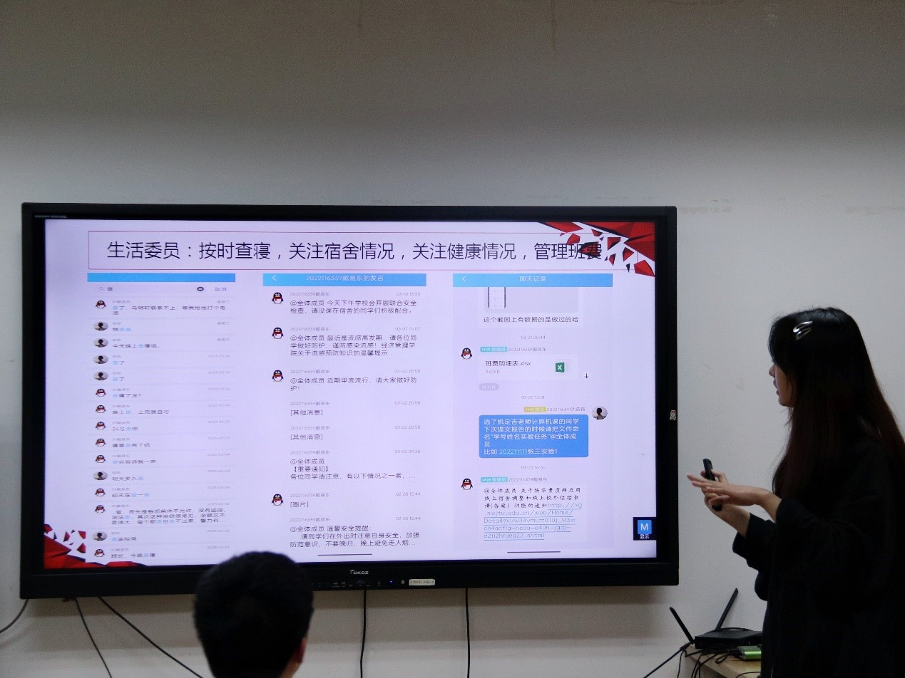 辅导员薄慧和王子琦对各位班长的交流发言和工作中的问题困难都一一记录、认真解答。针对大家提到的共性问题,薄慧建议各位班长在今后的班级工作中,要善于联合开展活动;要深入班级同学中,及时了解同学的学习生活动态,对于突发事件,更要第一时间给辅导员老师汇报。王子琦建议班长们要用热心、细心、责任心去服务同学,起到模范带头作用,并在工作中提升自己的思维能力和沟通能力,积极主动、勇敢热忱地做好班级建设,营造良好的班级氛围,与同学、辅导员老师密切联系,从而一起建设团结的、优秀的班集体。同时,二位老师也针对班长们的PPT制作细节也提出了优化建议。