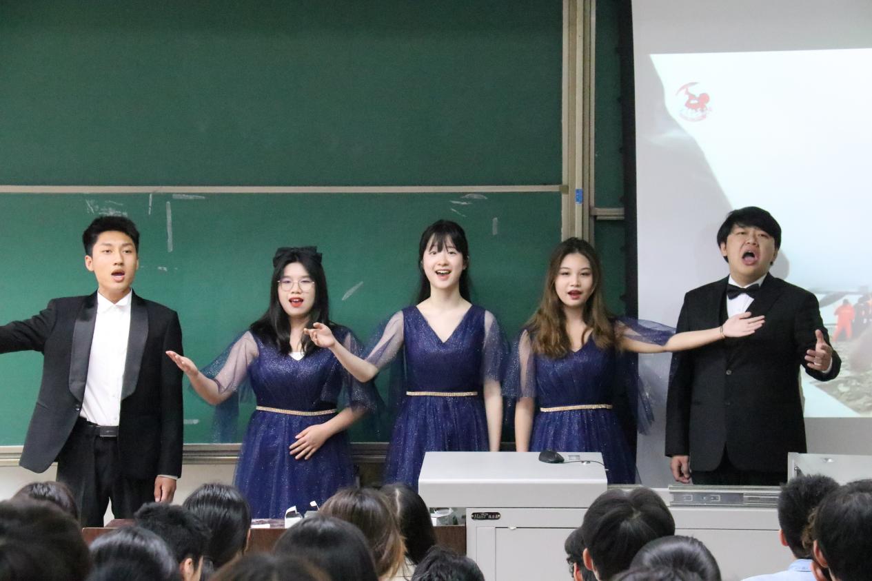 本期座谈会邀请到“音乐里的故事”《为了谁》讲演团。讲演团以生动感人的语言阐述了在2008年汶川特大地震时无数志愿者、医疗人员、救援队员、普通民众挺身而出,在最短的时间内,在废墟下抢救出一个又一个生命的故事。同时,讲演团结合图片和视频展现了在波澜壮阔的抗震救灾斗争中广大党员干部和人民军队战胜一切艰难险阻的大无畏精神以及临危不惧、舍生忘死的英雄气概。一个个紧急救援的真实故事,一幕幕令人动容的画面使得在场同学们无不动容,共同举起手中的小红旗合唱歌曲。
