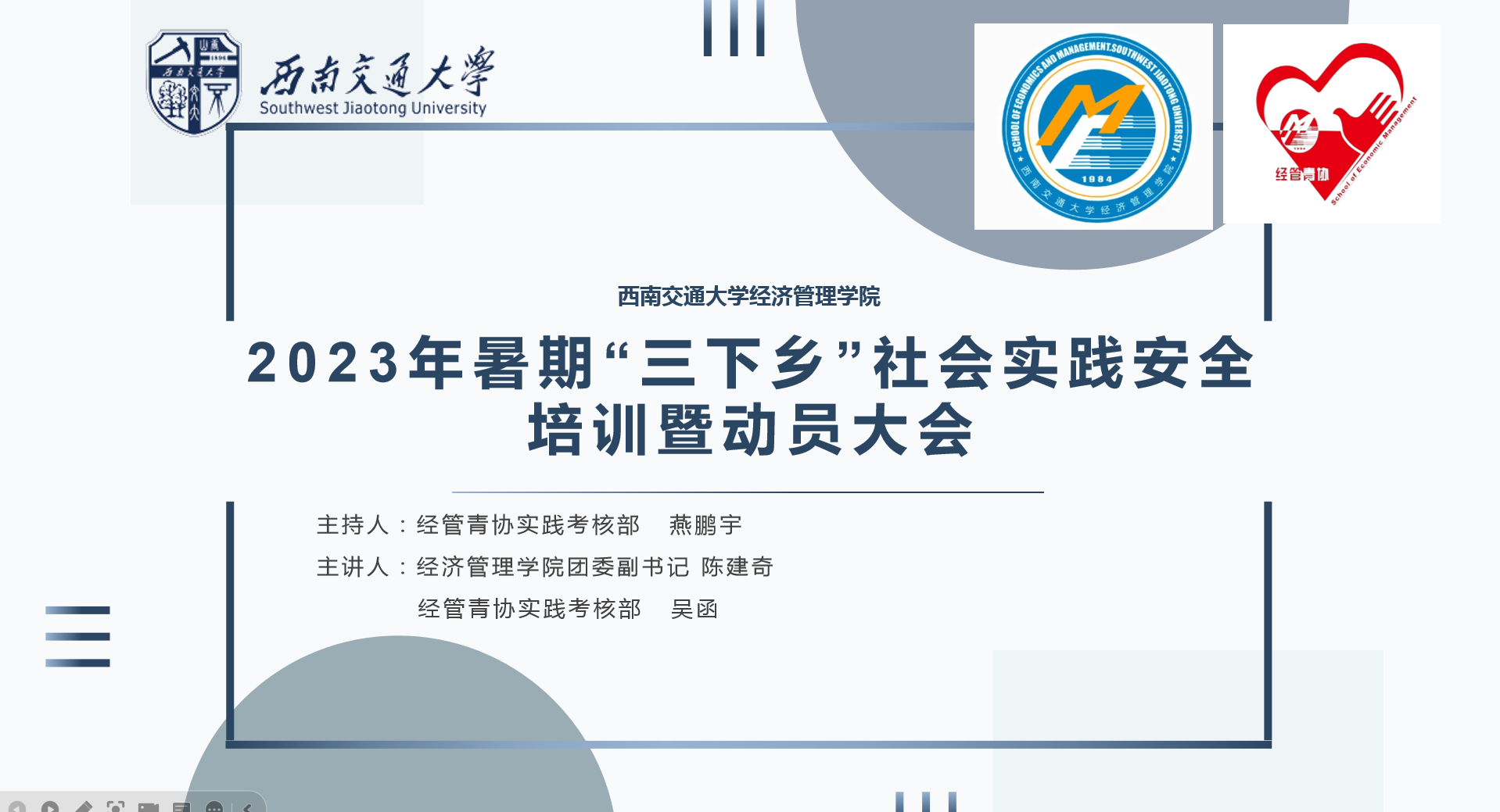 暑期“三下乡”社会实践安全培训暨动员大会在线上举行,学院团委副书记陈建奇、青年志愿者协会干部以及20支校、院级及专项队伍一起参加了大会。