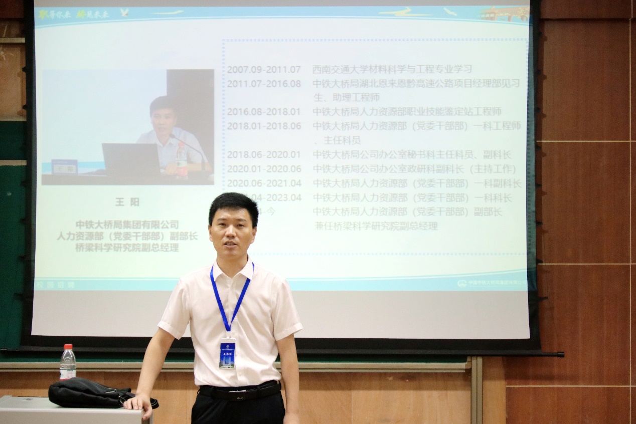 优秀校友王阳回忆了自己的个人成长经历。他从三个方面介绍了自己加入中铁大桥局的理由:1.集团能够为大家提供强大的优秀的平台,比如国家重点实验室和超级工程等;2.能够为大家提供良好的成长环境,如完善的培养体系、特色的培养机制和综合实力强劲的合作伙伴;3.加入中铁大桥局会有优秀的师兄师姐做榜样,在成长过程中提供无微不至的关怀和帮助。
