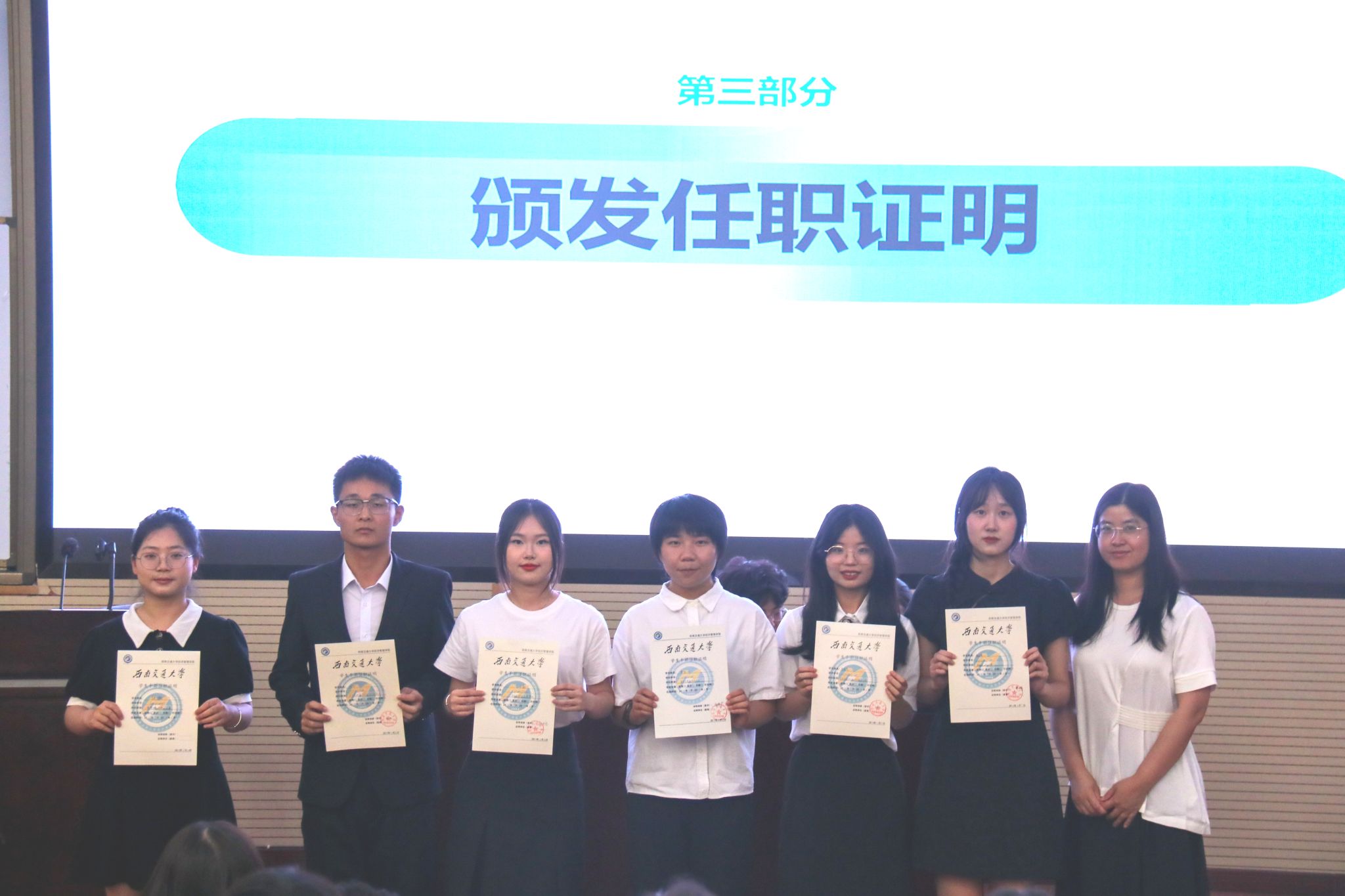 余小英老师为各团学组织主席团成员代表颁发了任职证书并为大会致辞。她对同学们的积极态度和工作表现给予了肯定,同时对新任团学组织干部提出了三点要求:扛起责任、勇于奉献和努力成长。