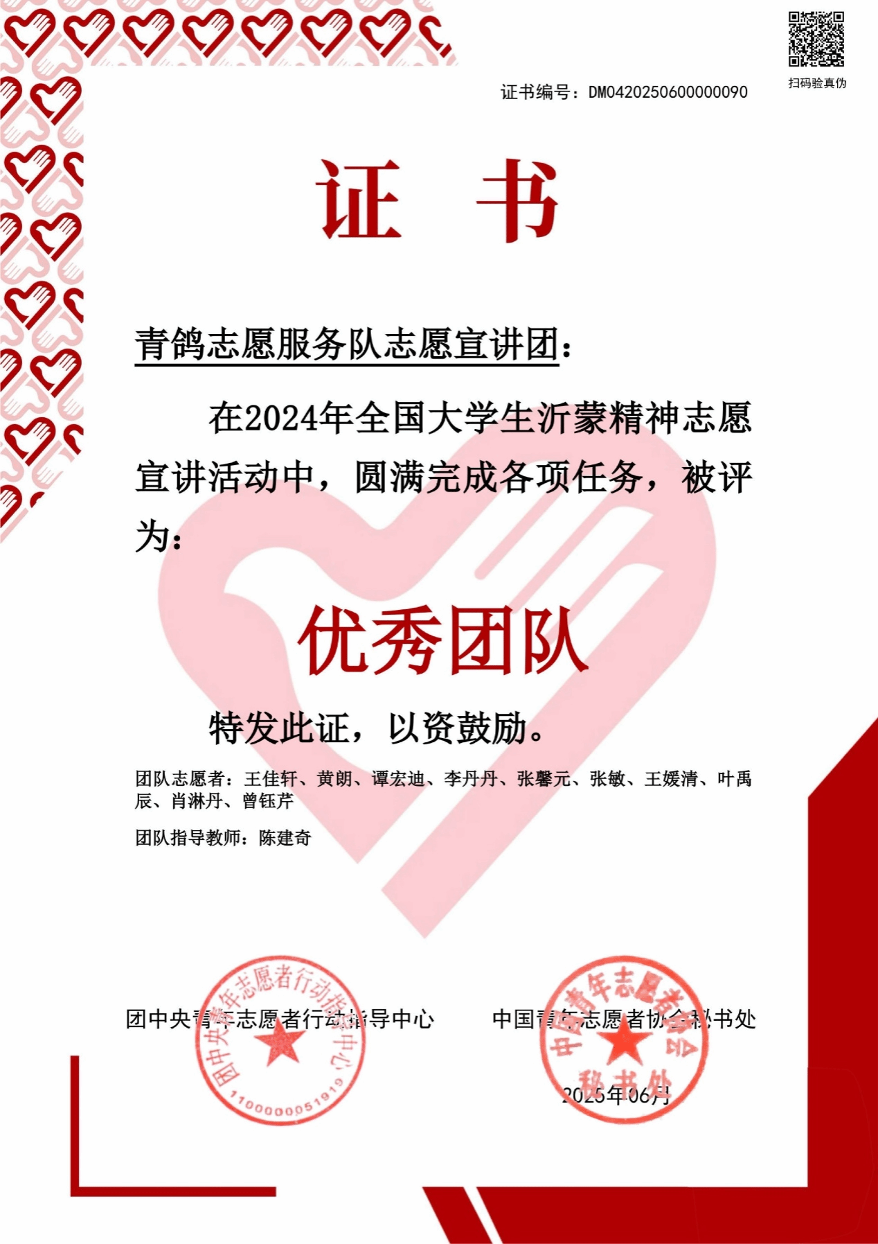 青鸽志愿服务队沂蒙精神志愿宣讲团圆满完成各项任务,被评为优秀团队。