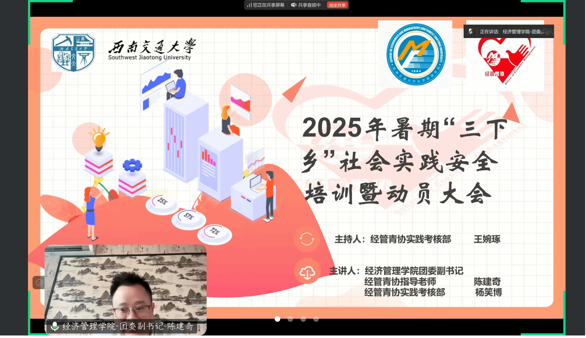 2025年暑期“三下乡”社会实践安全培训暨动员大会在线上举行,学院团委副书记陈建奇、青年志愿者协会干部以及24支校级、院级以及专项队伍一起参加了大会。
