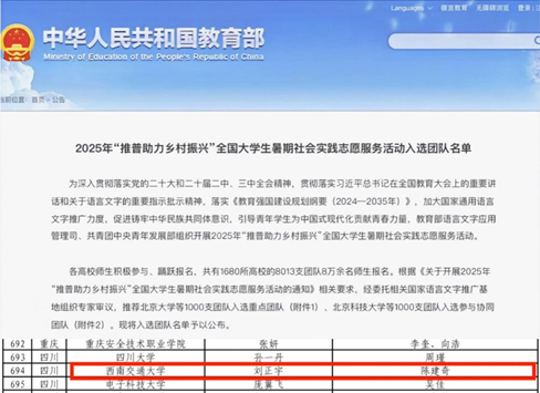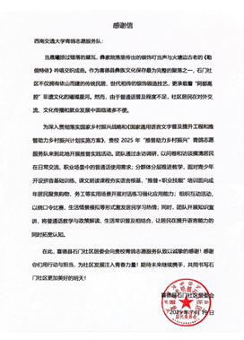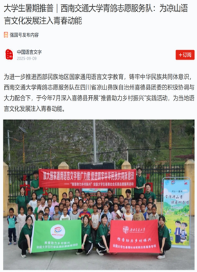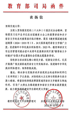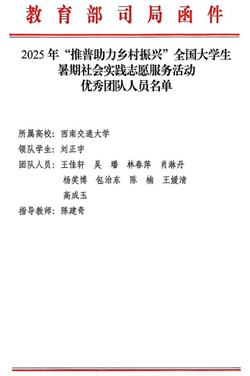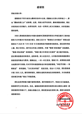 “言传凉山普,语通四方情” 推普助力乡村振兴社会实践团队精心谋划实践方案、创新设计活动形式,扎实开展系列志愿服务。团队以实际行动促进铸牢中华民族共同体意识,取得显著成效,并于近日收到来自教育部的表扬信。