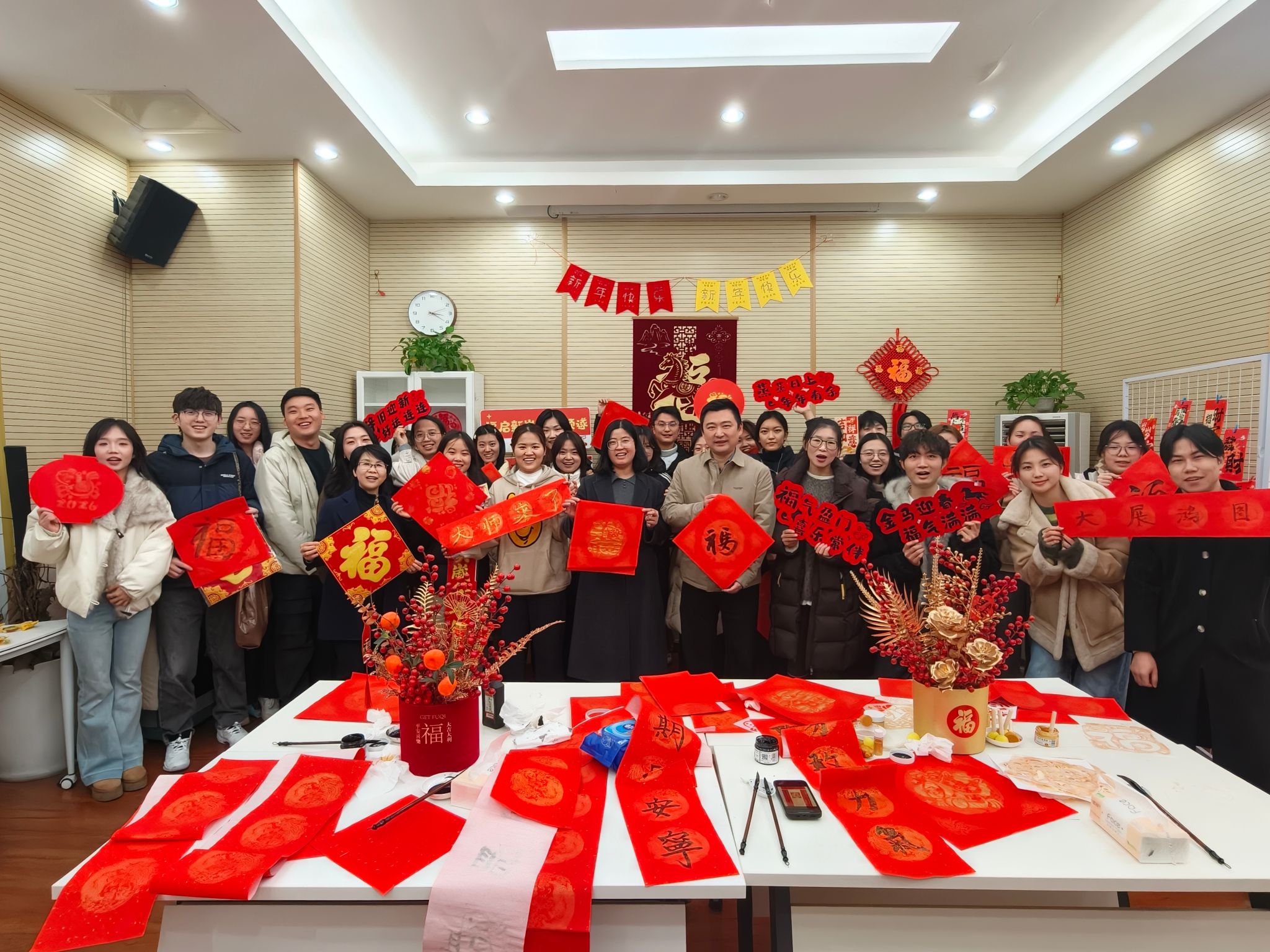 红纸铺展,楹联随吉祥流转;妙笔生辉,翰墨携马蹄飞扬。老师、同学们悬腕运笔,挥毫如舞。须臾之间,辞旧岁、迎新春的吉联成对展颜,一副副融入骏马意象的“福”字与春联跃然纸上。这些墨宝佳作不仅涵盖了“马到成功”“一马当先”的美好寓意,同时也承载了师生们对新年幸福吉祥的祈愿。
