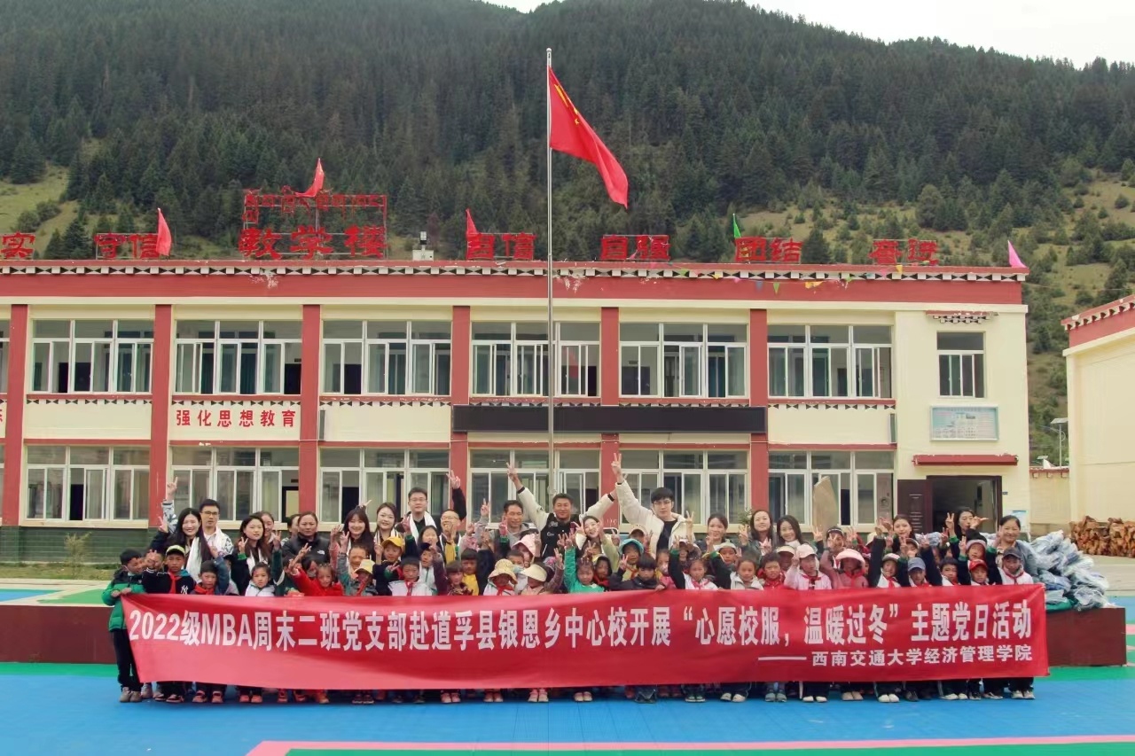 2022级MBA周末二班临时党支部发起的“心愿校服·温暖过冬”主题党日活动在四川省甘孜州道孚县银恩乡中心校如期举行。该活动不仅为道孚县银恩乡中心校100余名孩子送上了新校服、新书包和学习用品,更送去了西南交大莘莘学子的暖暖爱心。