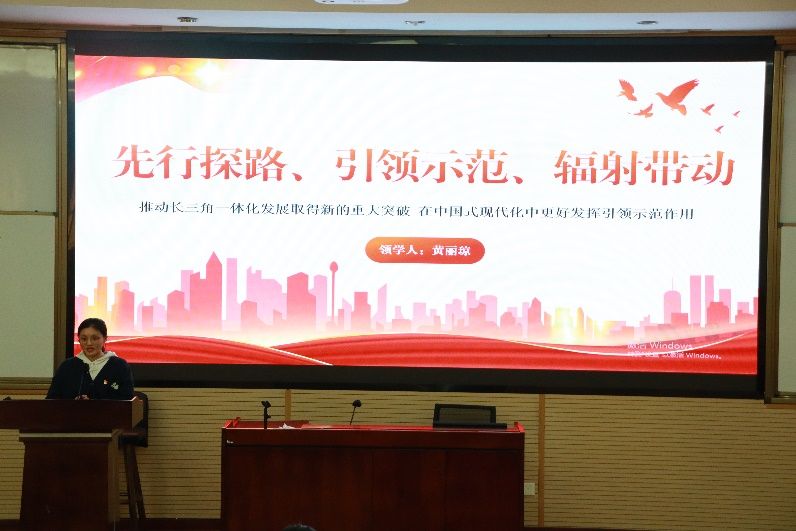 会议第一个议程,由领学人黄丽琼同志为我们带来了关于“推动长三角一体化发展取得新的重大突破,在中国式现代化中更好发挥引领示范作用”这一主题的分享。她用“先行探路、引领示范、辐射带动”三个关键词对本次专题学习进行概括总结,深入介绍了长三角一体化战略的背景及意义,发展历程,问题与未来规划等内容,同时她也将长三角一体化发展同四川现代化发展相结合,针对协同发展、创新发展、绿色发展提出了自己的思考和见解。