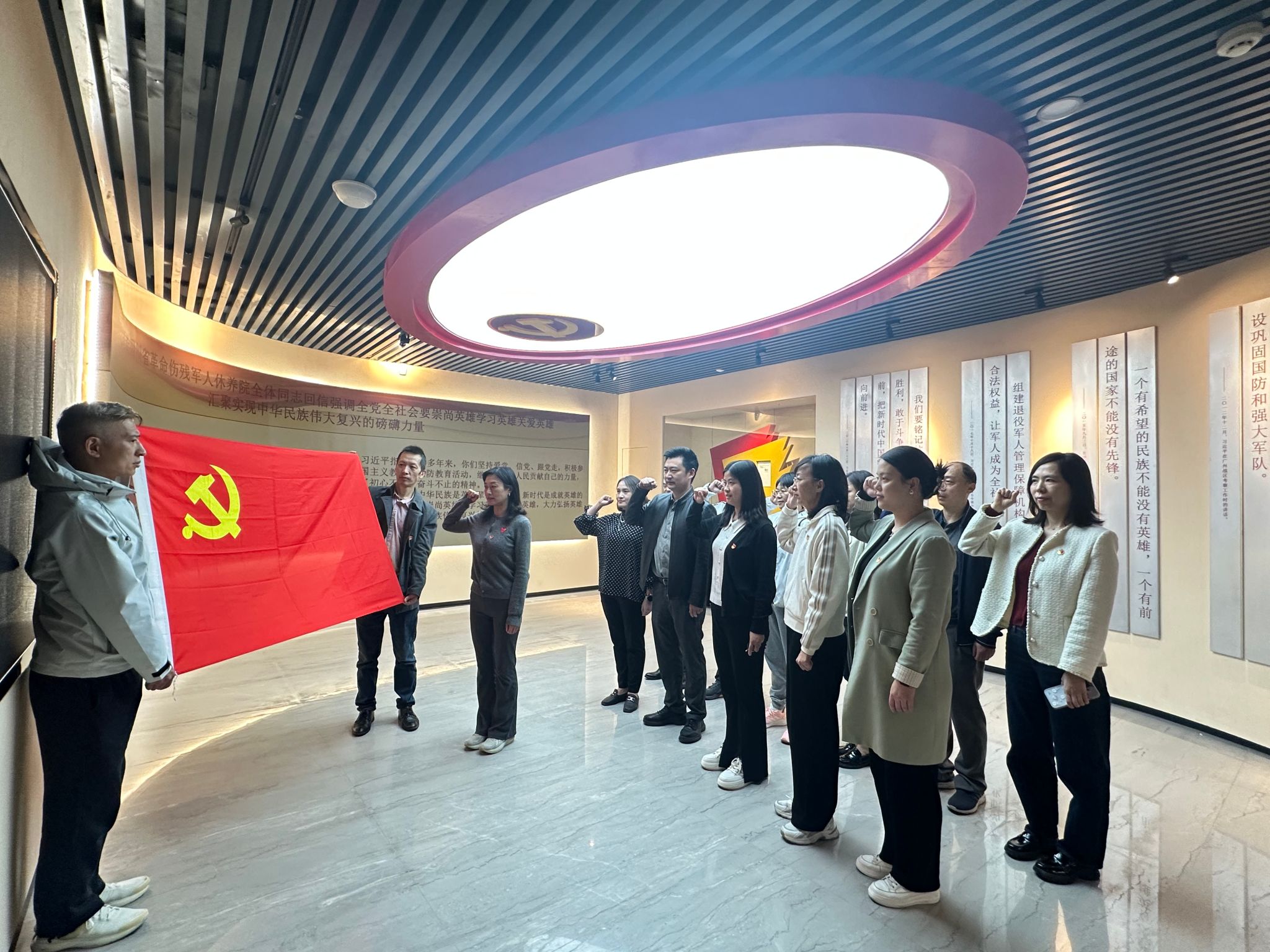 在荣军博物馆全体党员面对鲜红的党旗,举起右拳,重温入党誓词,铿锵有力的誓词直击内心,使在场每一个党员更进一步认识到了自己肩上的责任与义务。