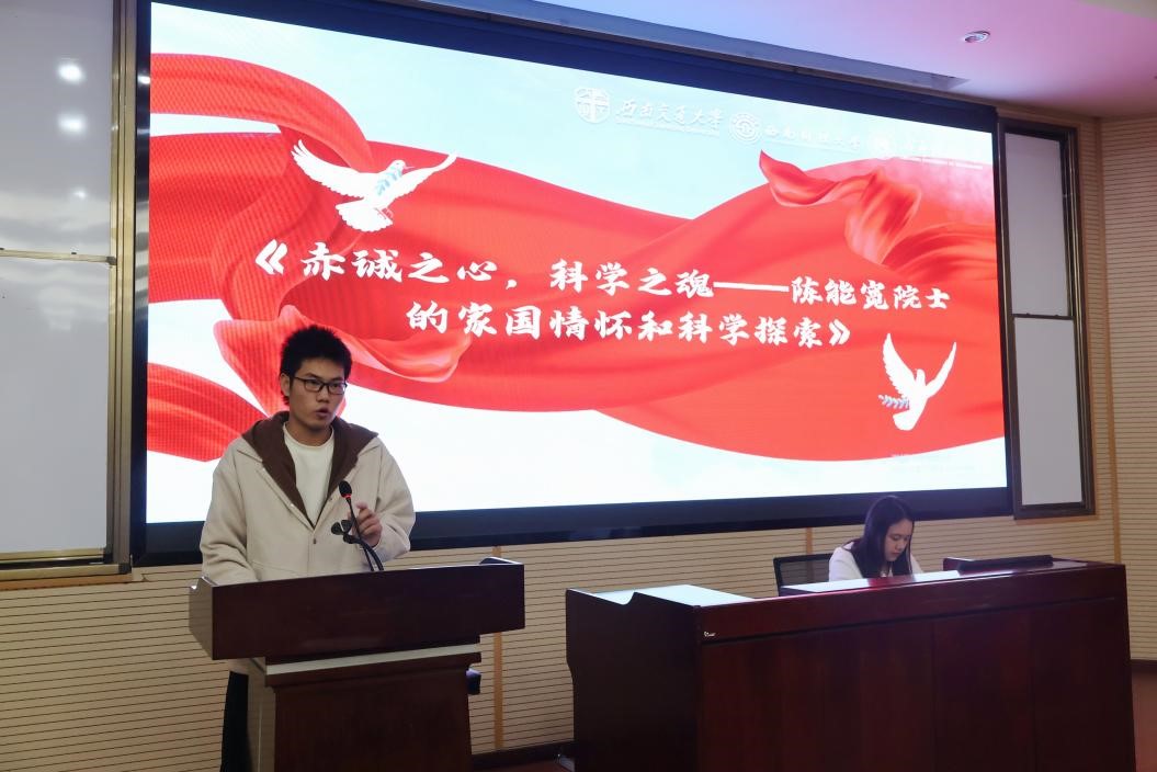 活动第一环节为理论联学,来自三所学校的支部结合学校或专业特色进行了专题分享。西南交通大学“繁星逐梦”科学家精神宣讲团讲师高朝阳首先带来了《赤诚之心,科学之魂——陈能宽院士的家国情怀和科学探索》的专题宣讲,展现了陈能宽院士的家国情怀与科学探索精神,激励在场的各位同志学习红色精神,坚定理想信念,以报国为己任,将科学研究融入国家发展过程当中。