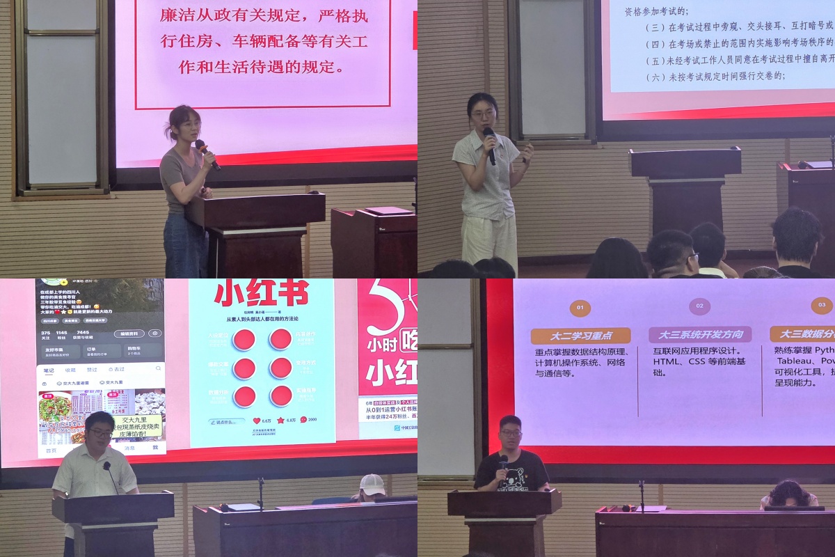 第四党支部副书记钟文婷同志带领全体党员系统学习规定内容,并结合典型案例展开警示教育。第三党支部副书记王重月同志领学《西南交通大学本科生考试违规处理办法》,以制度条例和真实事例敲响纪律警钟。第三党支部党员刘芫硕同志结合自身经历,分享其在自媒体运营上从兴趣挖掘到内容创作的全过程。第四党支部党员杭麟奇同志则围绕自身技能提升与学习实践,推荐了一系列有助于提升专业能力和综合素质的技能。两位党员强调在学业与生活中要坚守纪律底线,以严谨的态度对待学习和实践。最后,支部全体成员庄严签订《诚信考试承诺书》。