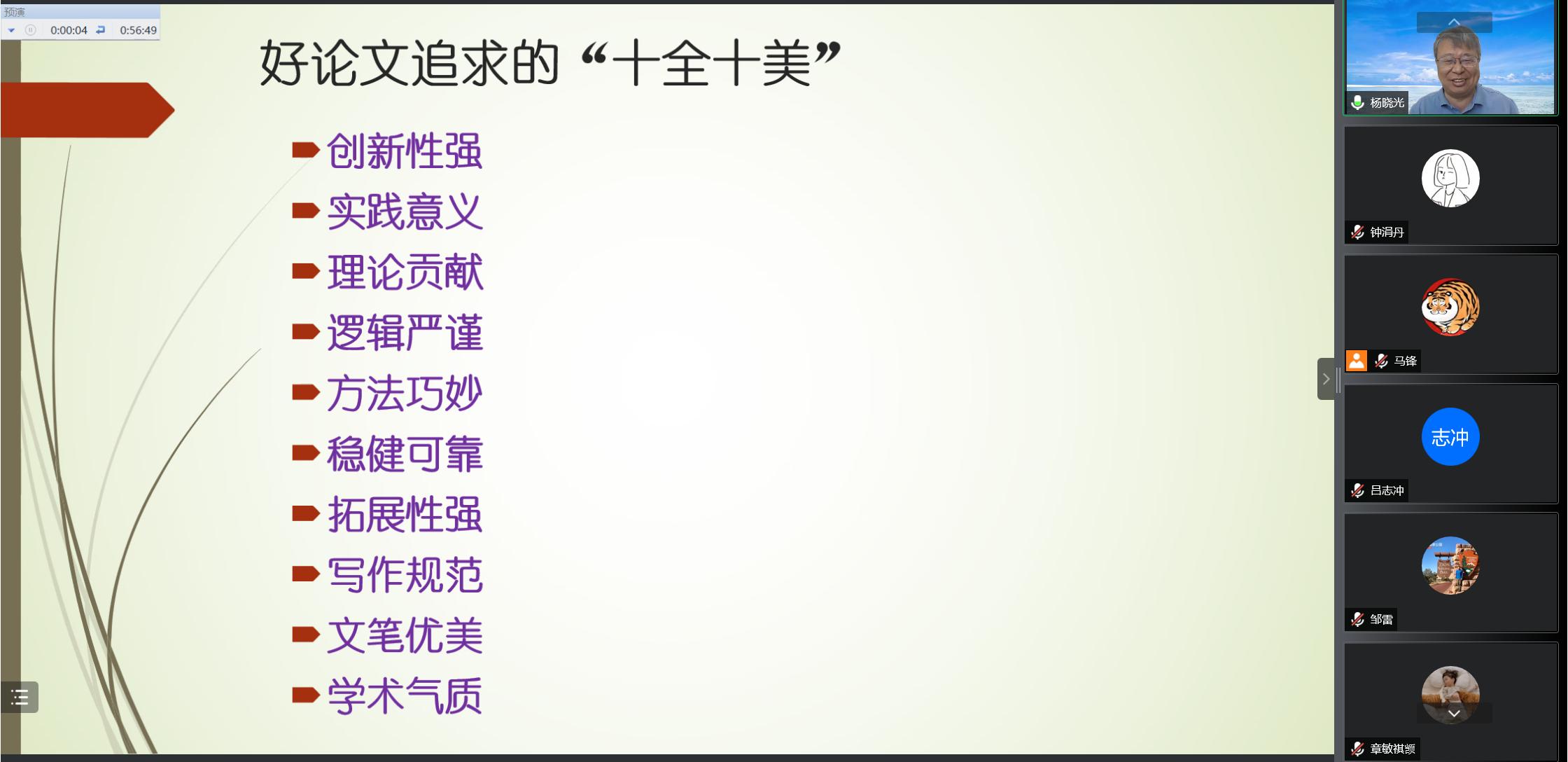 杨晓光研究员从审稿人的角度,围绕研究选题、逻辑论证和行文吸睛三个方面对科学研究的相关问题展开详细讲解;他谈到文章的选题方面要以问题为导向,找寻正确的研究问题,设计清晰的研究方案;在研究内容的发面,应做实做长逻辑链条,提高研究的可靠性,重点阐述对关键问题的解决方法,展现科学研究的学术思想;最后杨晓光研究员以好论文追求的“十全十美”为结,并祝愿大家力耕不辍,让科研和创新的梦想展翅高飞。