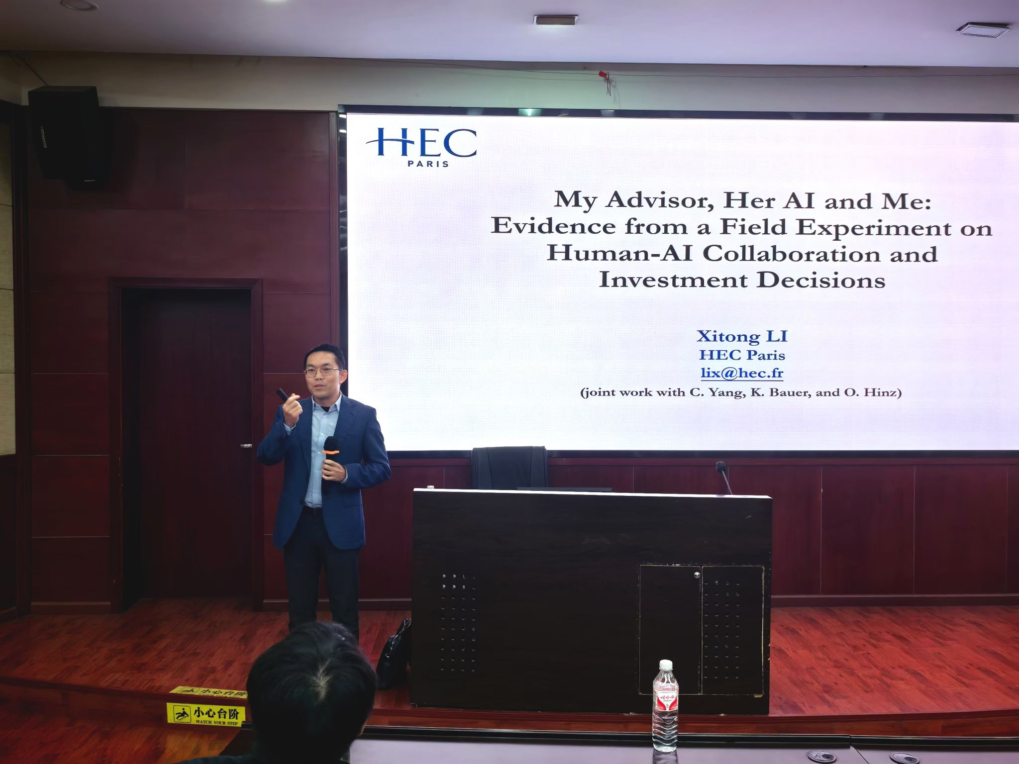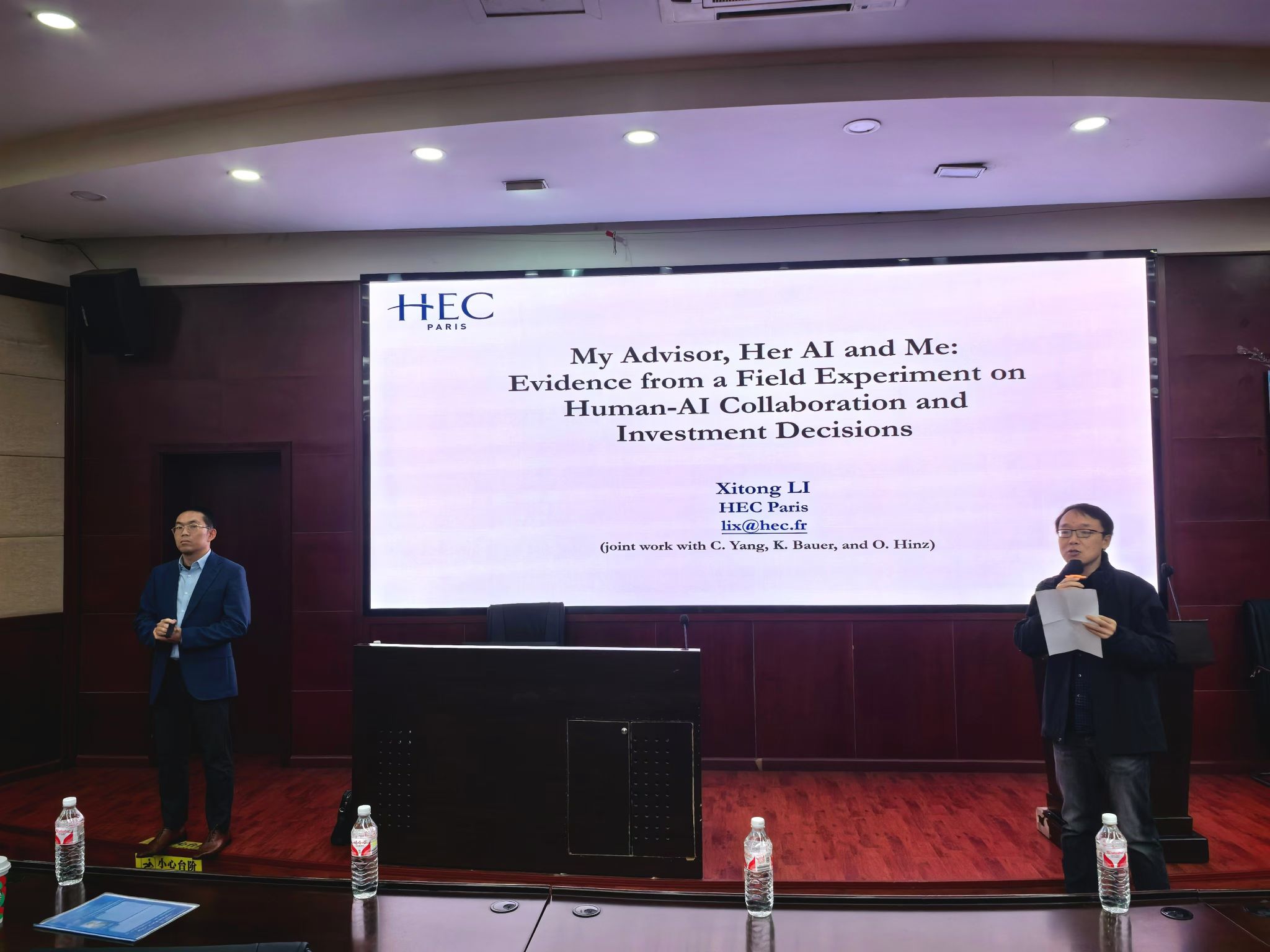 师生带来题为“My Advisor, Her AI and Me: Evidence from a Field Experiment on Human-AI Collaboration and Investment Decisions”的学术讲座。学院院长韩科教授、学系部分老师及研究生共30余人参与此次学术交流活动。学院信息系统与运营管理系耿维教授主持活动,他向师生介绍了李喜彤教授的学术背景与成就,并对李喜彤教授表示欢迎与诚挚的感谢。