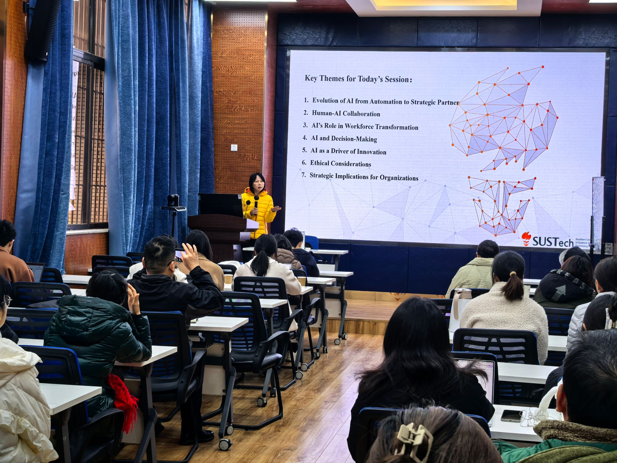 柯玮玲教授从“Evolution of Al from Automation to Strategic Partner”、“Human-AI Collaboration”、“AI's Role in Workforce Transformation”、“Al and Decision-Making”、“AI as a Driver of Innovation”以及“Ethical Considerations”等方面为大家带来了精彩的分享,并在学术交流的最后部分,提出了AI对于组织的战略启示。柯玮玲教授指出,AI应该作为我们的合作伙伴而非替代品;组织必须建立人与AI协作的文化;领导者必须确保AI系统是透明、公平的,并与组织价值观保持一致,同时要有强大的治理框架来减轻风险;组织应该利用AI进行持续的创新。