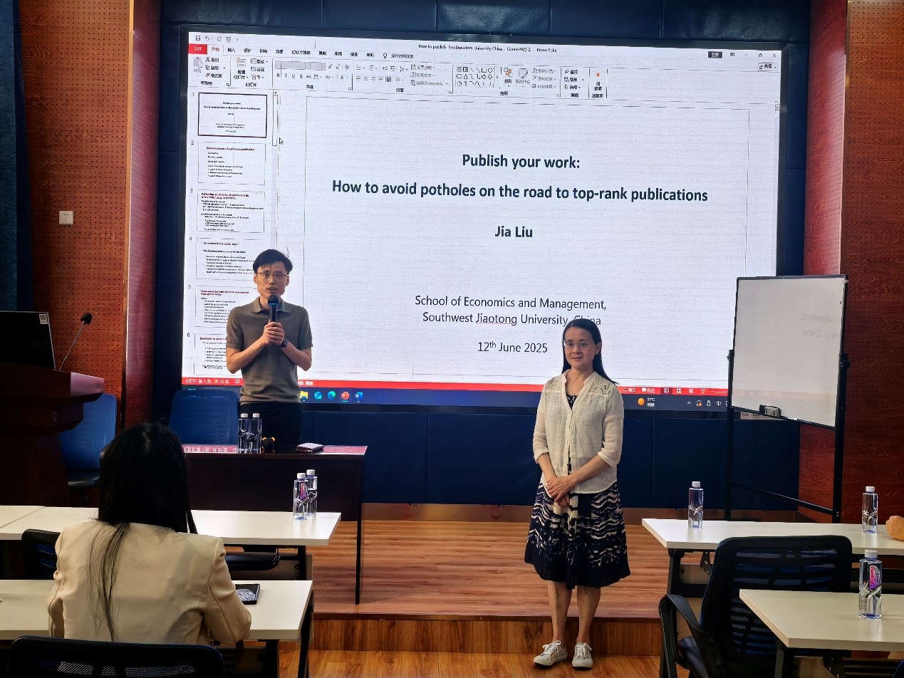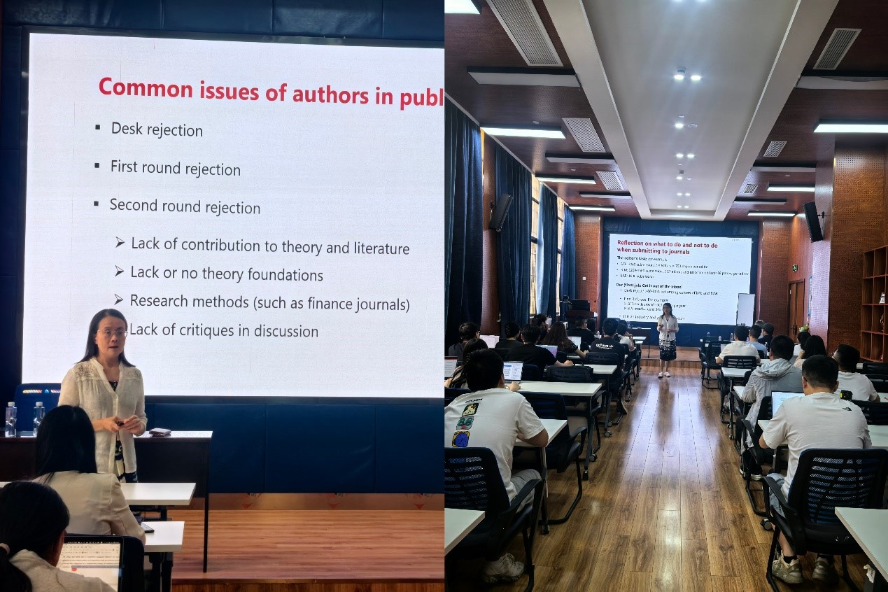 讲座期间,学院朱宏泉教授等与刘教授进行了深入互动,就“如何在论文中平衡文献综述与研究贡献的呈现”,“编辑和审稿人更偏好单一假设还是竞争性假设的表达方式”等问题展开讨论,刘教授逐一进行了细致解答。