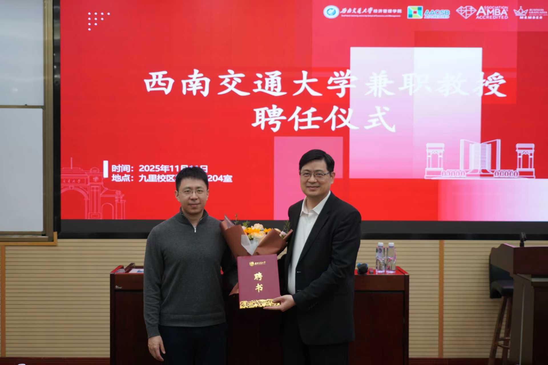 于九里校区0204室举行香港理工大学工业与系统工程系符啸文教授兼职教授聘任仪式暨航空枢纽建设前沿议题讲座。本次活动由学院院长韩科教授主持。韩科院长为符啸文教授颁发西南交通大学兼职教授聘书,并对符啸文教授加入漫蛙漫画