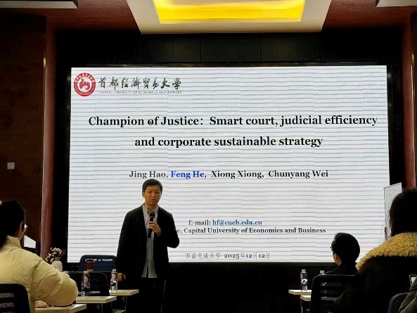 师生作题为“Champion of Justice: Smart Court, Judicial Efficiency and Corporate Sustainable Strategy”的学术讲座。此次讲座由学院马锋副院长主持,学院部分教师及研究生参加了此次讲座,马锋副院长首先对何枫教授的学术成果进行了介绍,同时对何教授的到来表示热烈的欢迎与感谢。